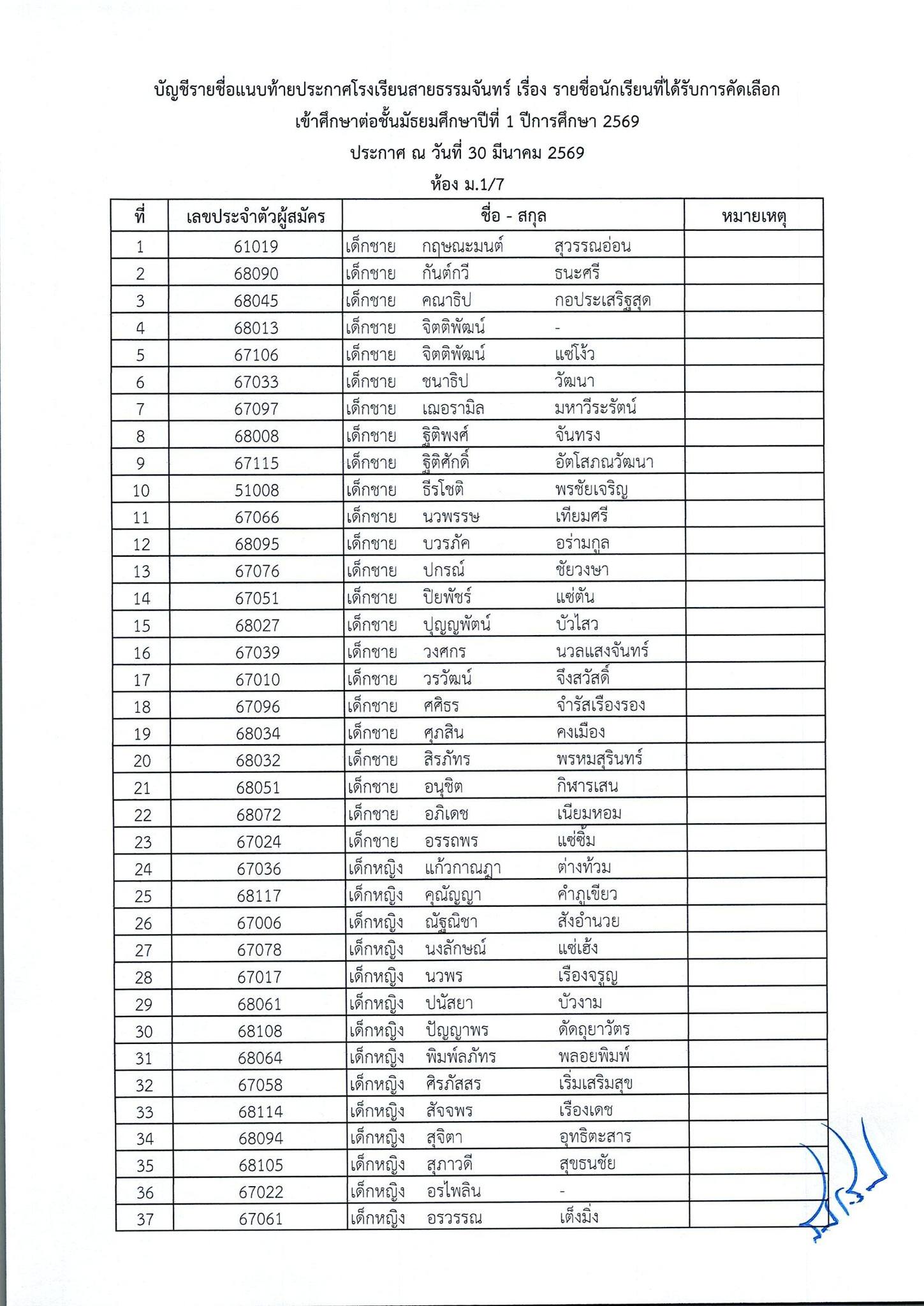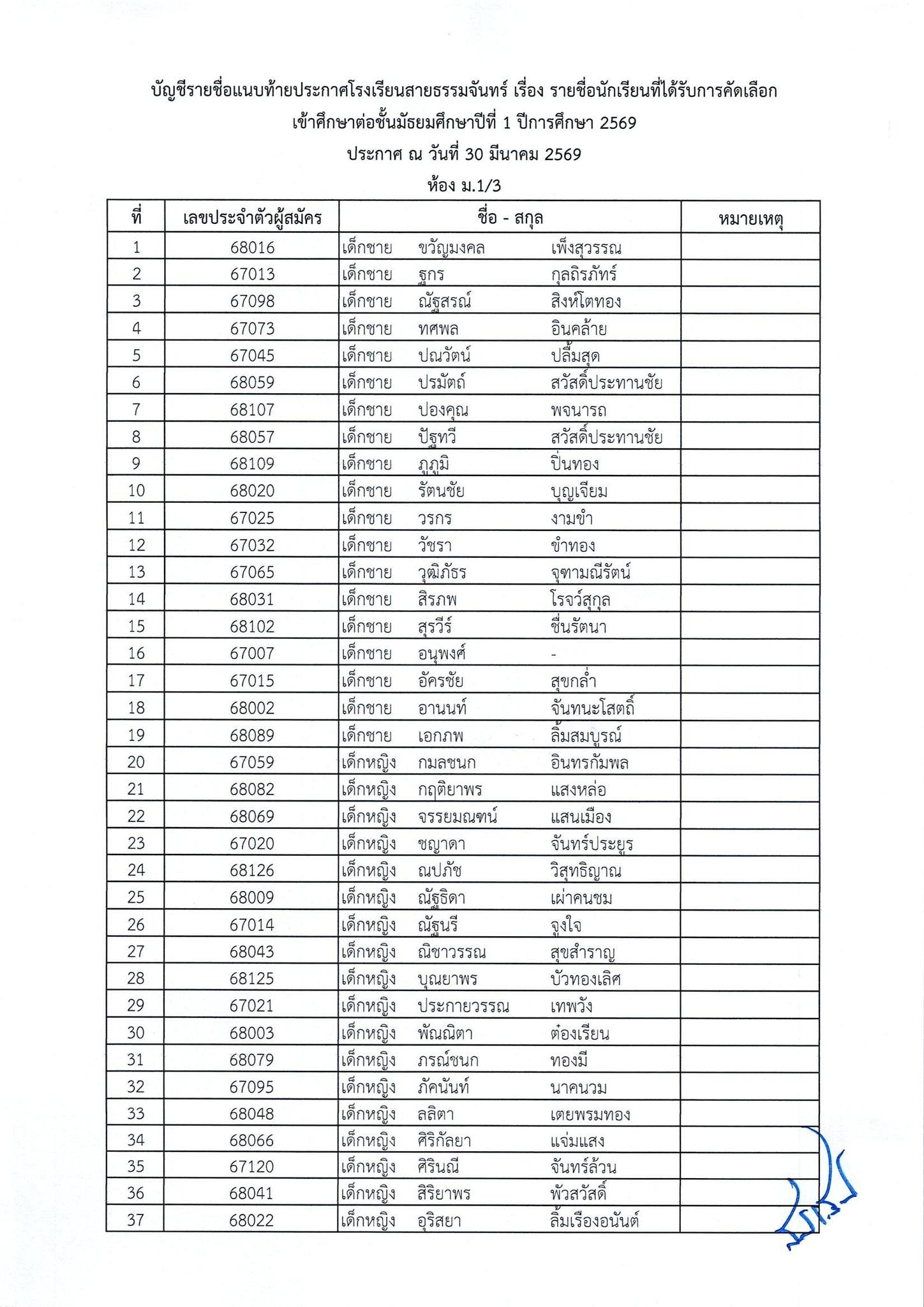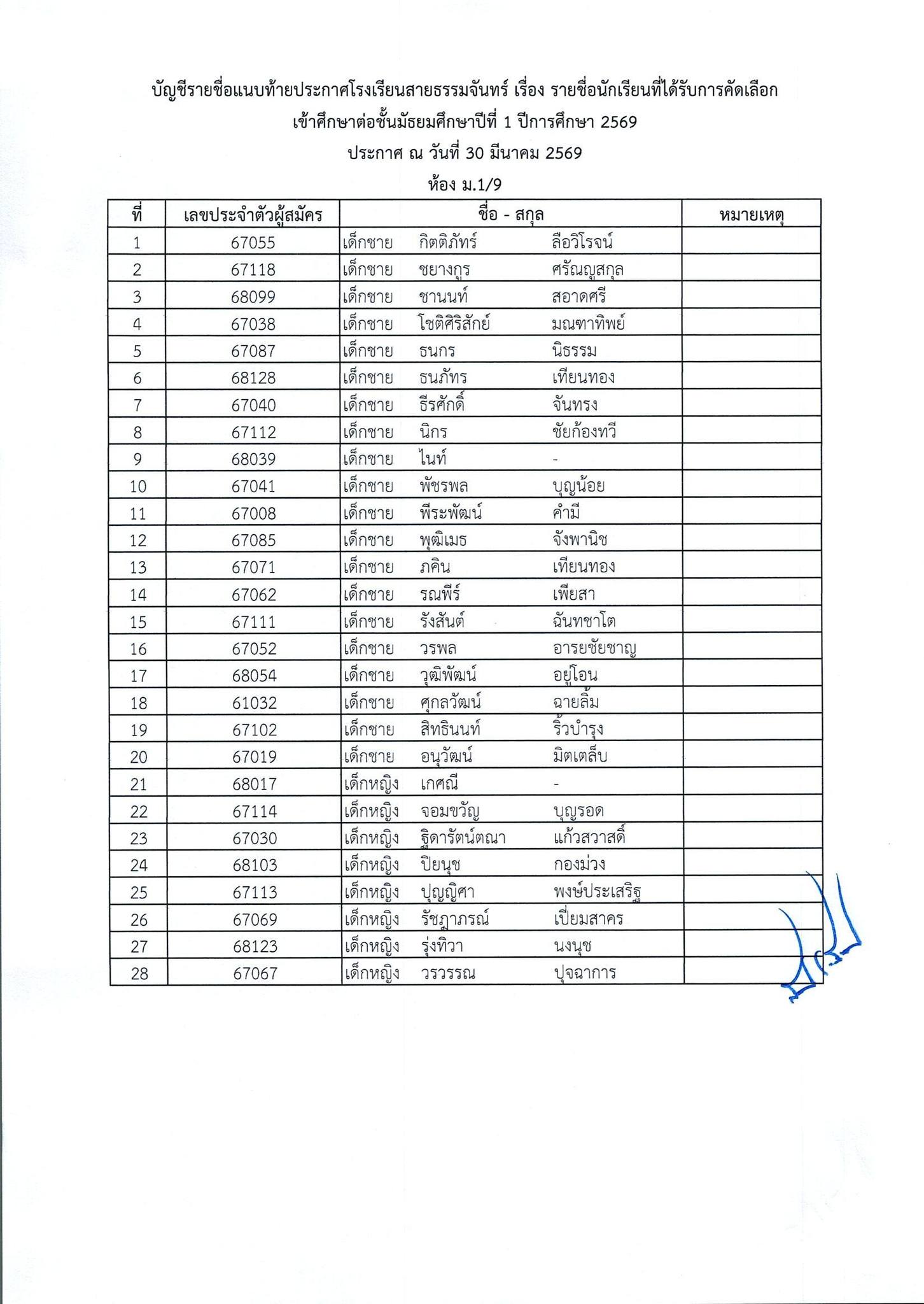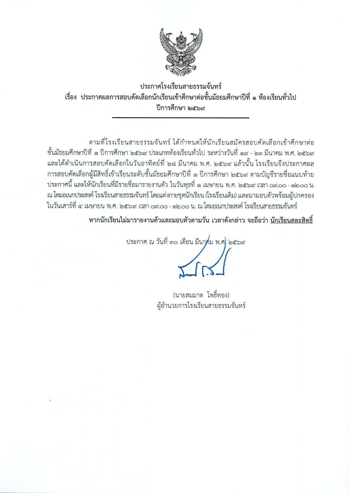 ประกาศผลการสอบคัดเลือกนักเรียนเข้าศึกษาต่อ ชั้นมัธยมศึกษาปีที่ 1 ห้องเรียนทั่วไป ปีการศึกษา 2569