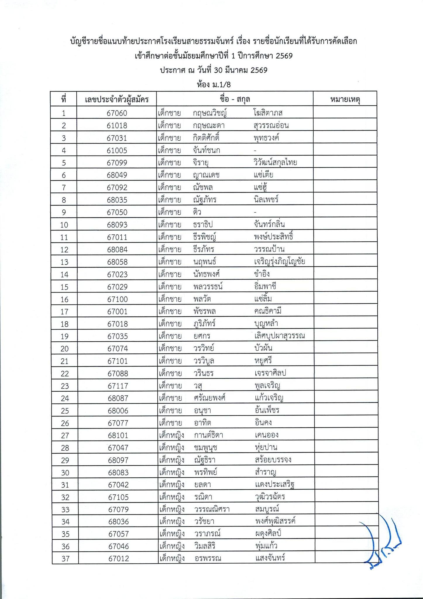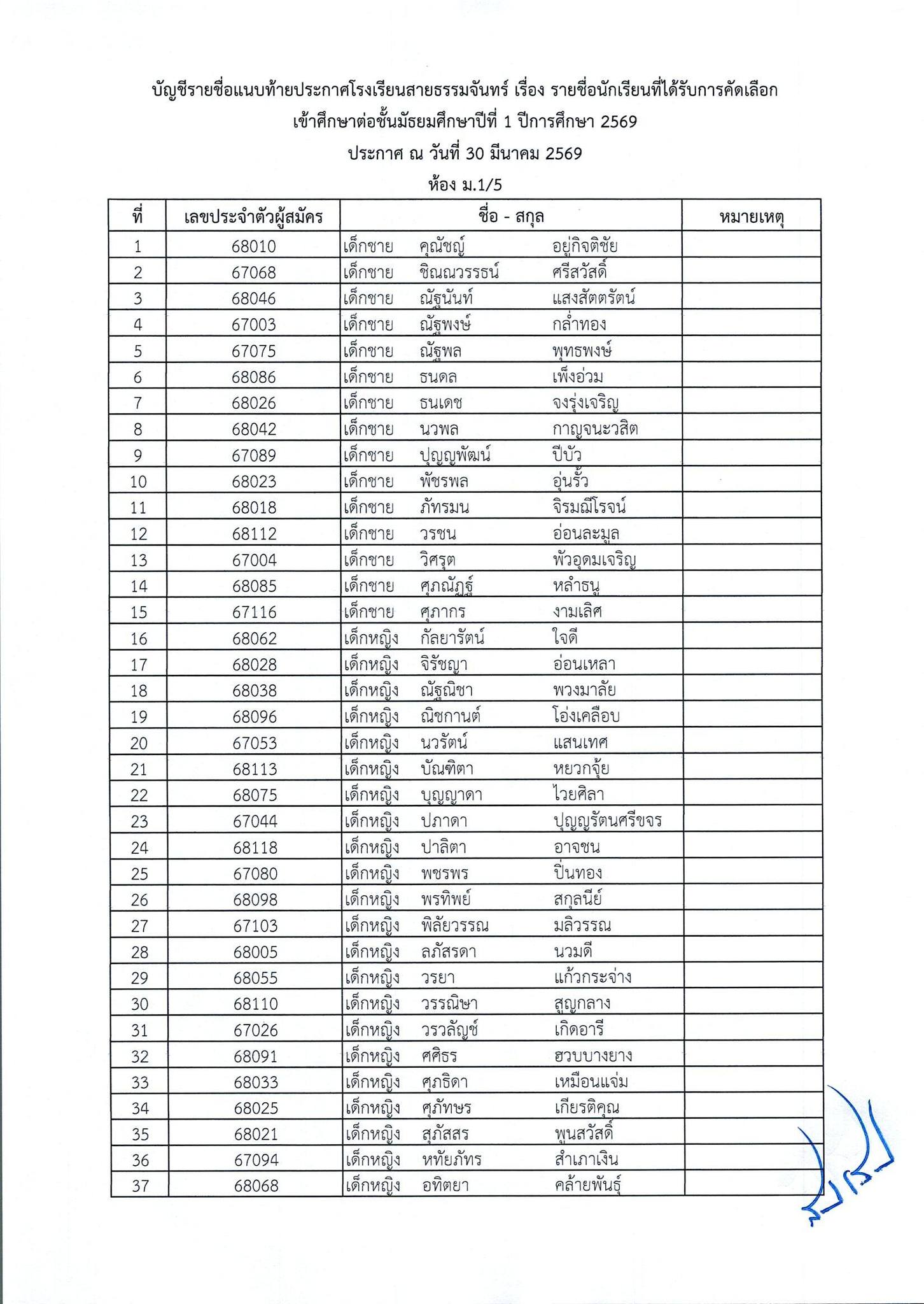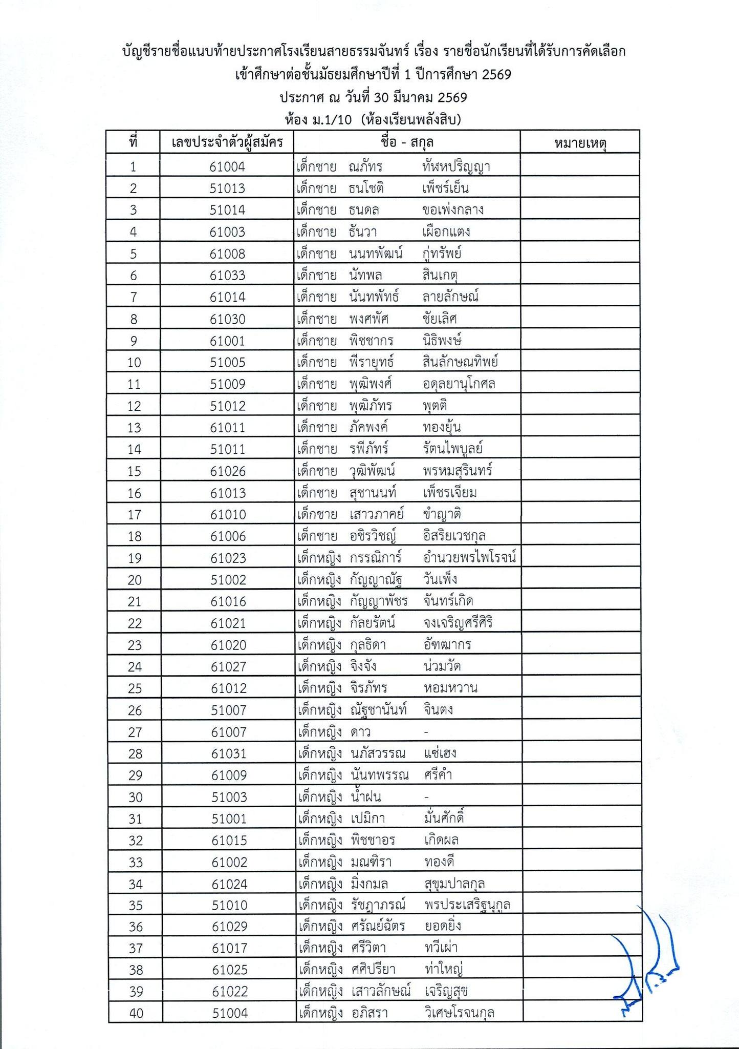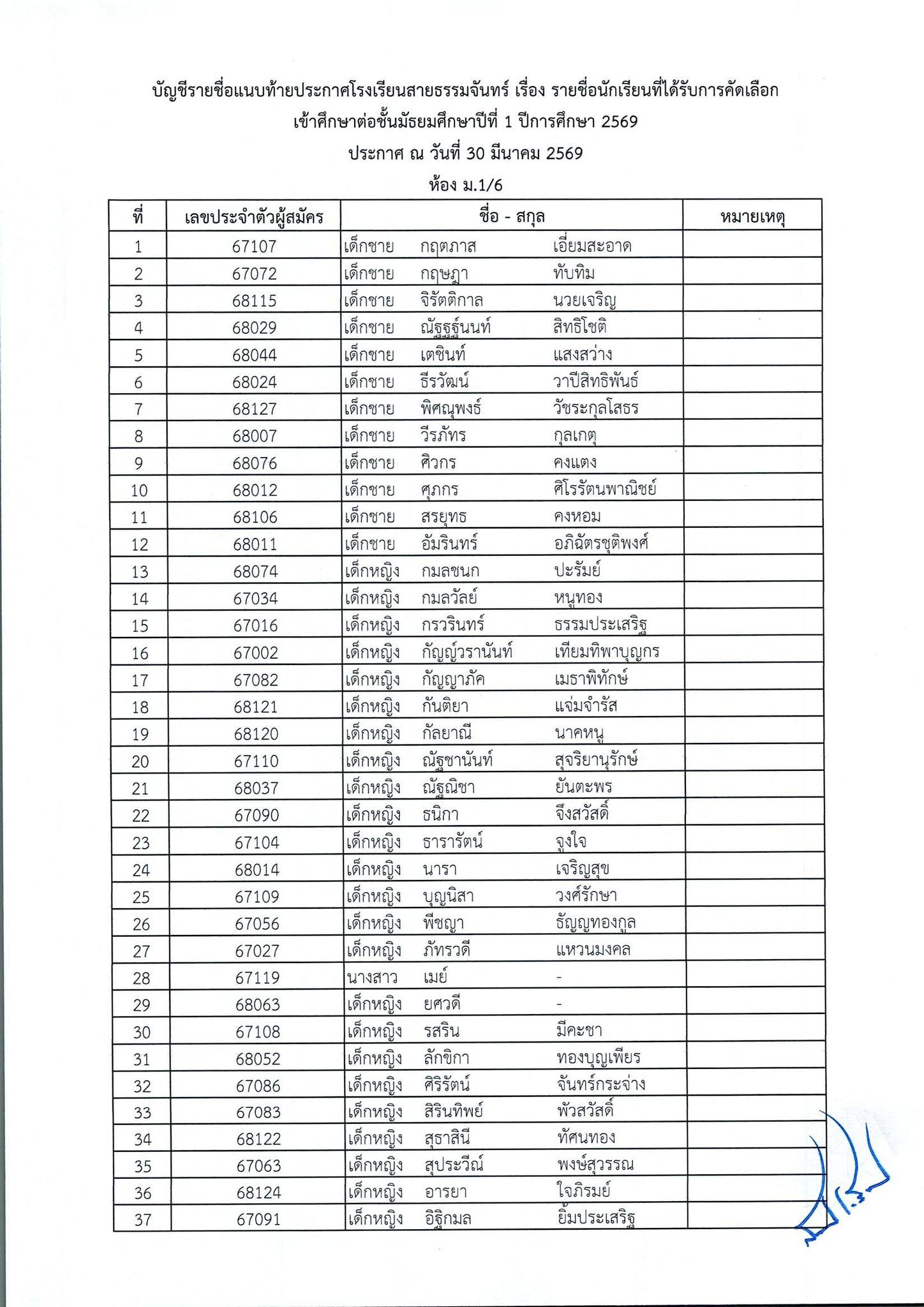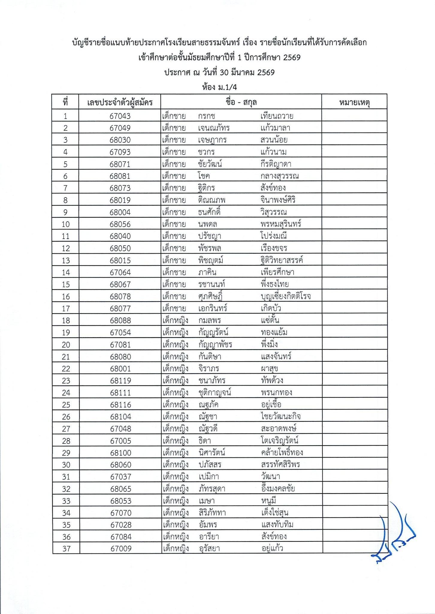 ประกาศผลการสอบคัดเลือกนักเรียนเข้าศึกษาต่อ ชั้นมัธยมศึกษาปีที่ 1 ห้องเรียนทั่วไป ปีการศึกษา 2569