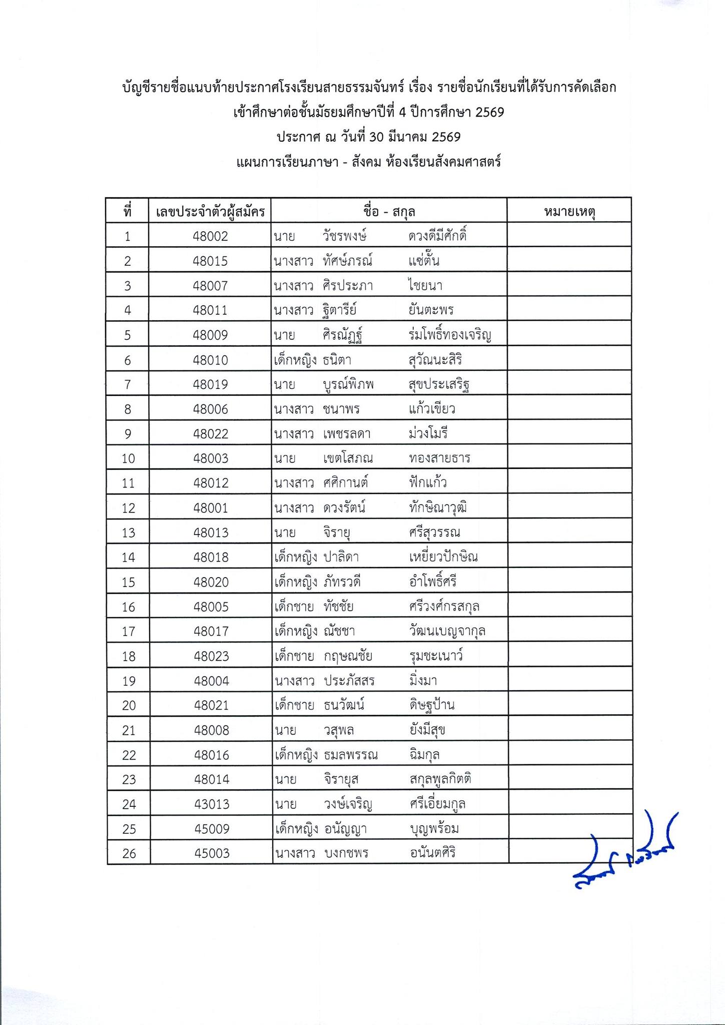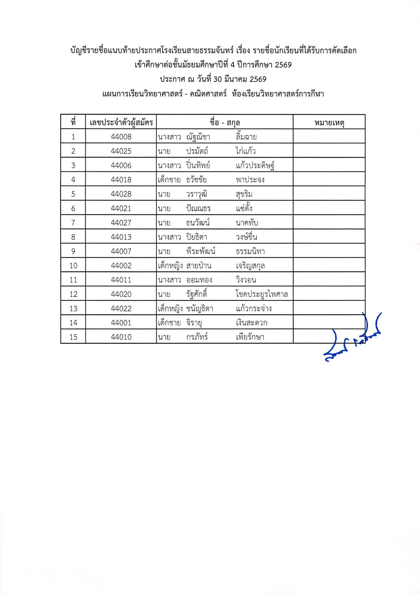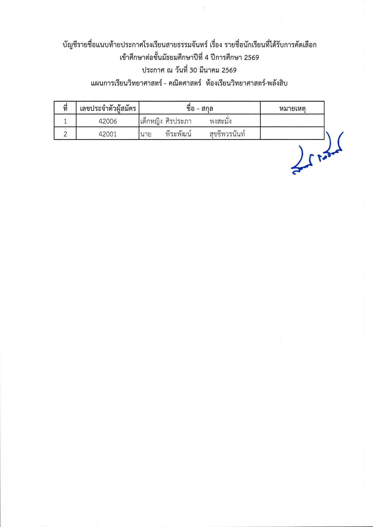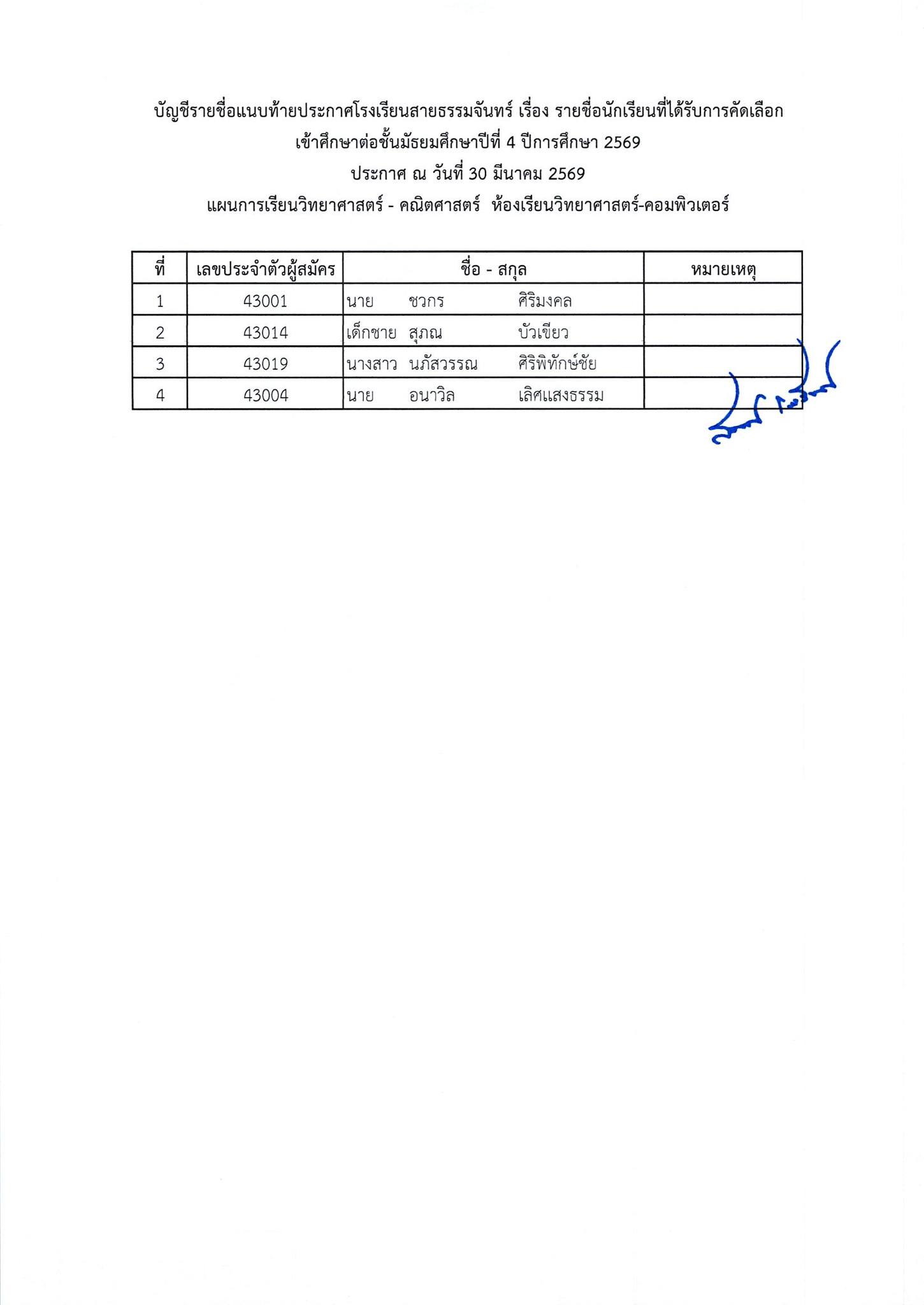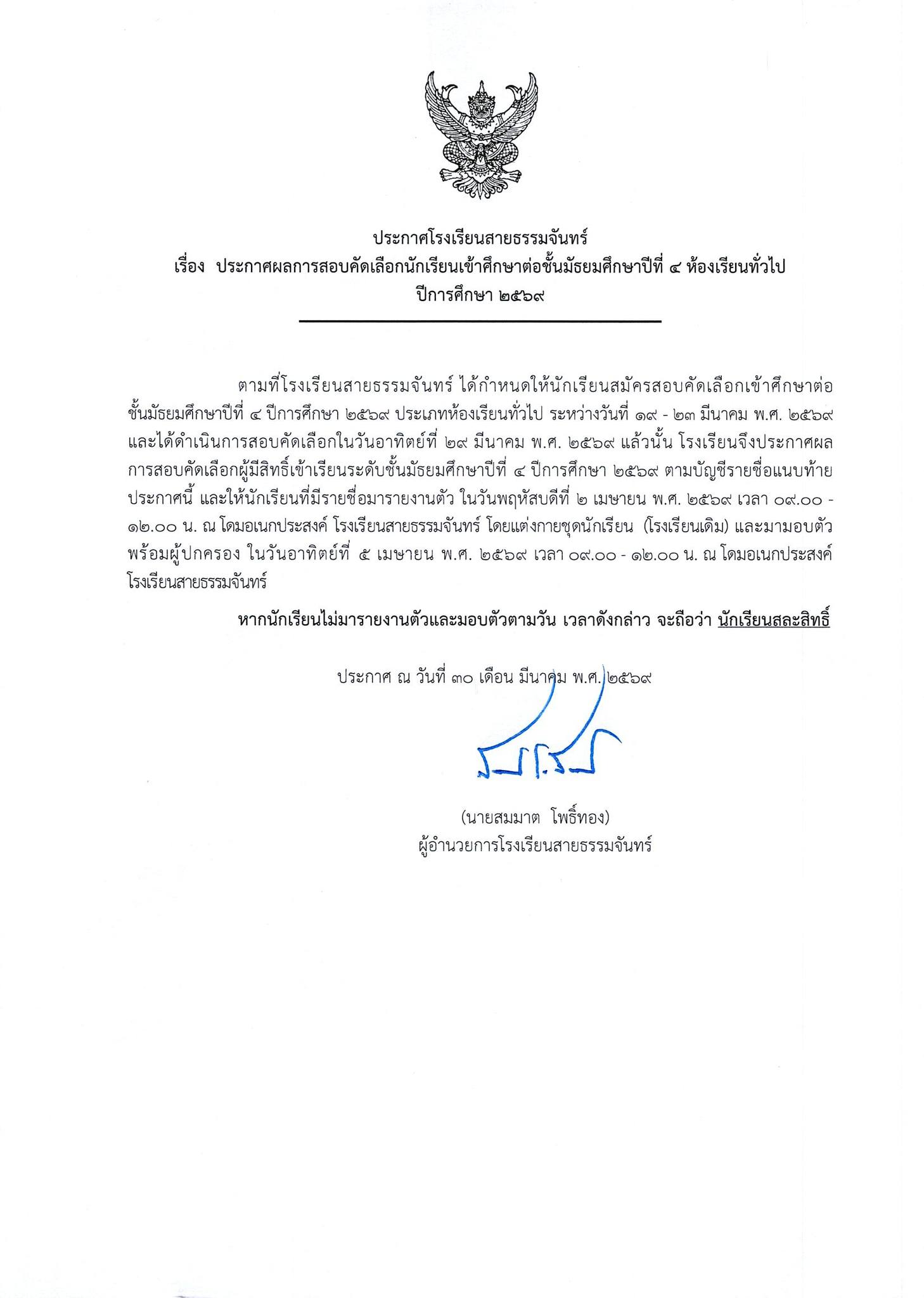 ประกาศผลการสอบคัดเลือกนักเรียนเข้าศึกษาต่อ ชั้นมัธยมศึกษาปีที่ 4 ห้องเรียนทั่วไป ปีการศึกษา 2569