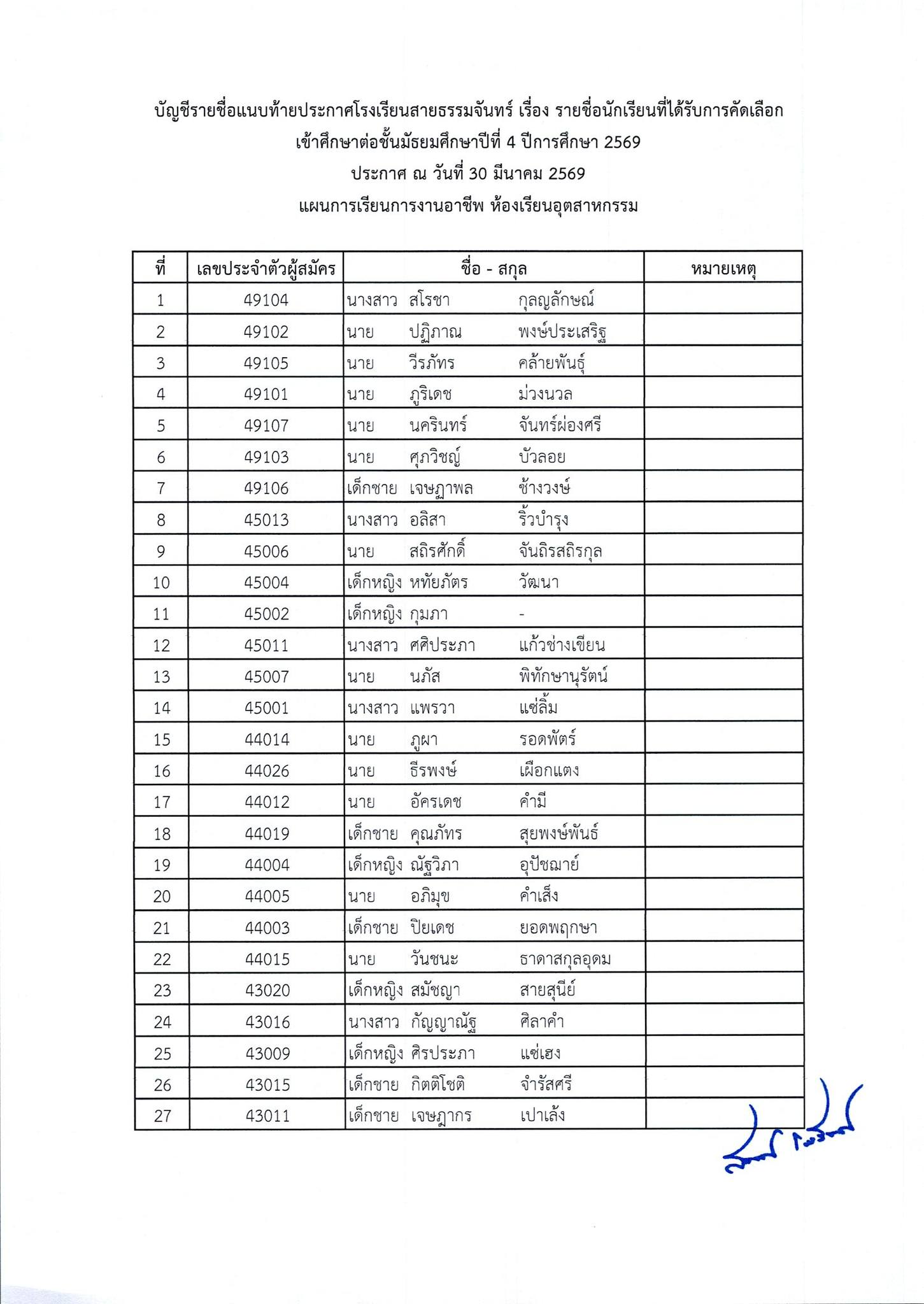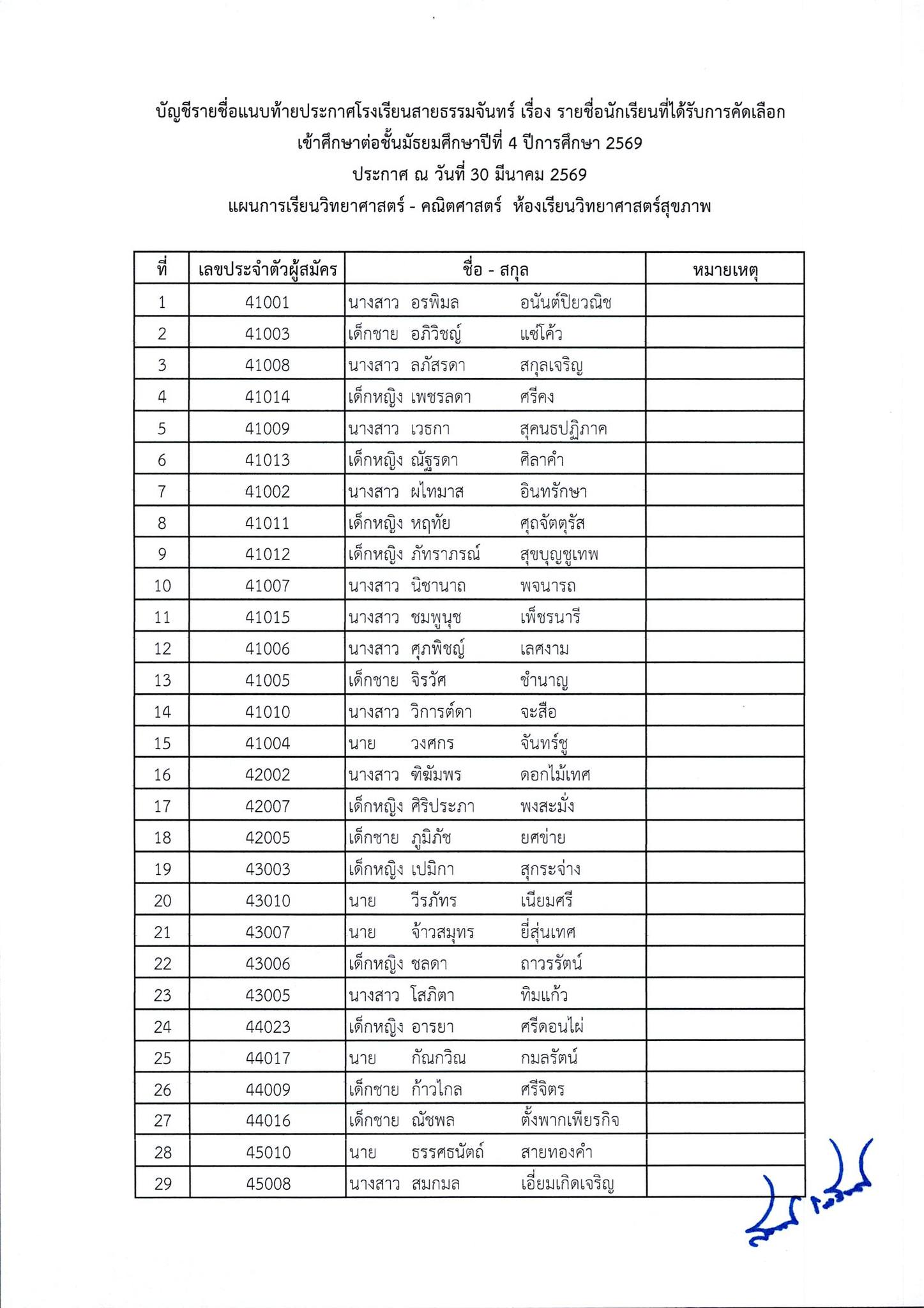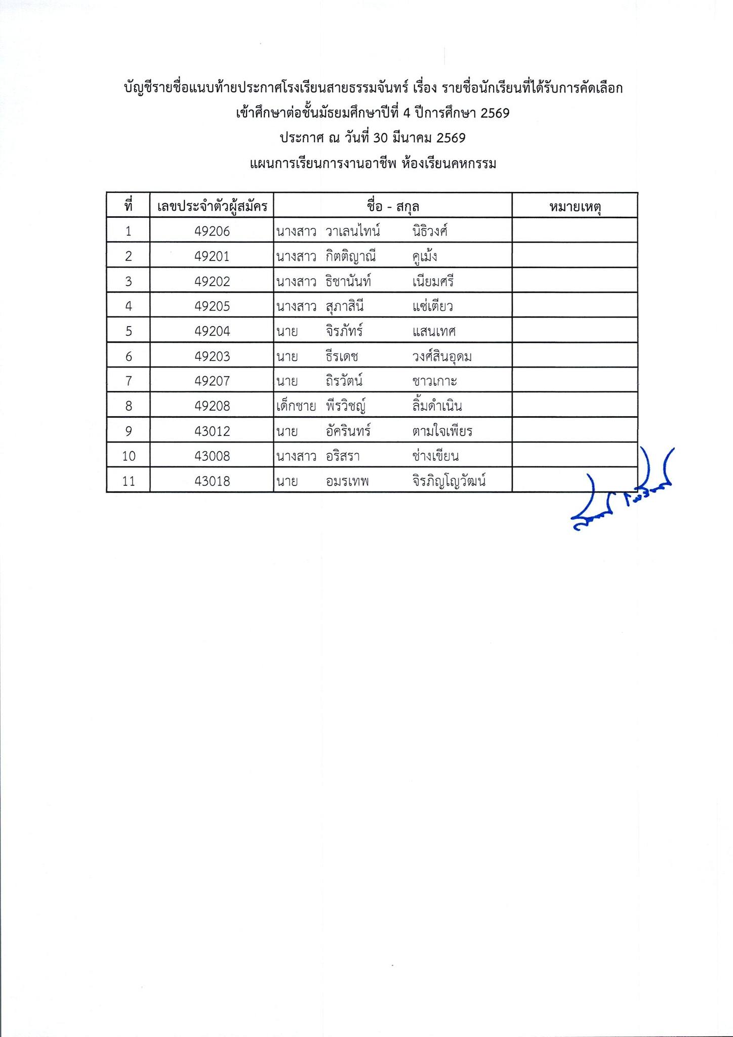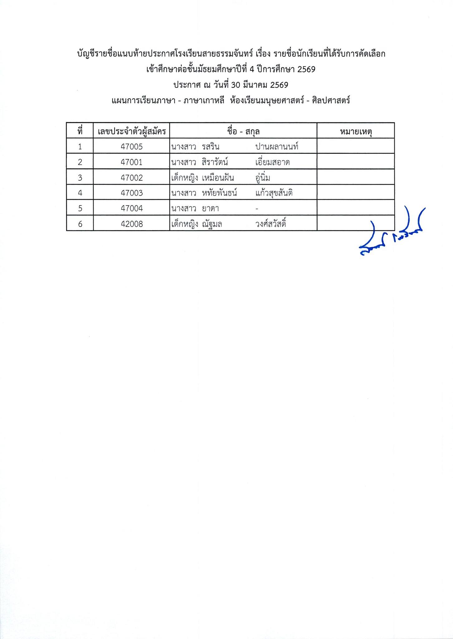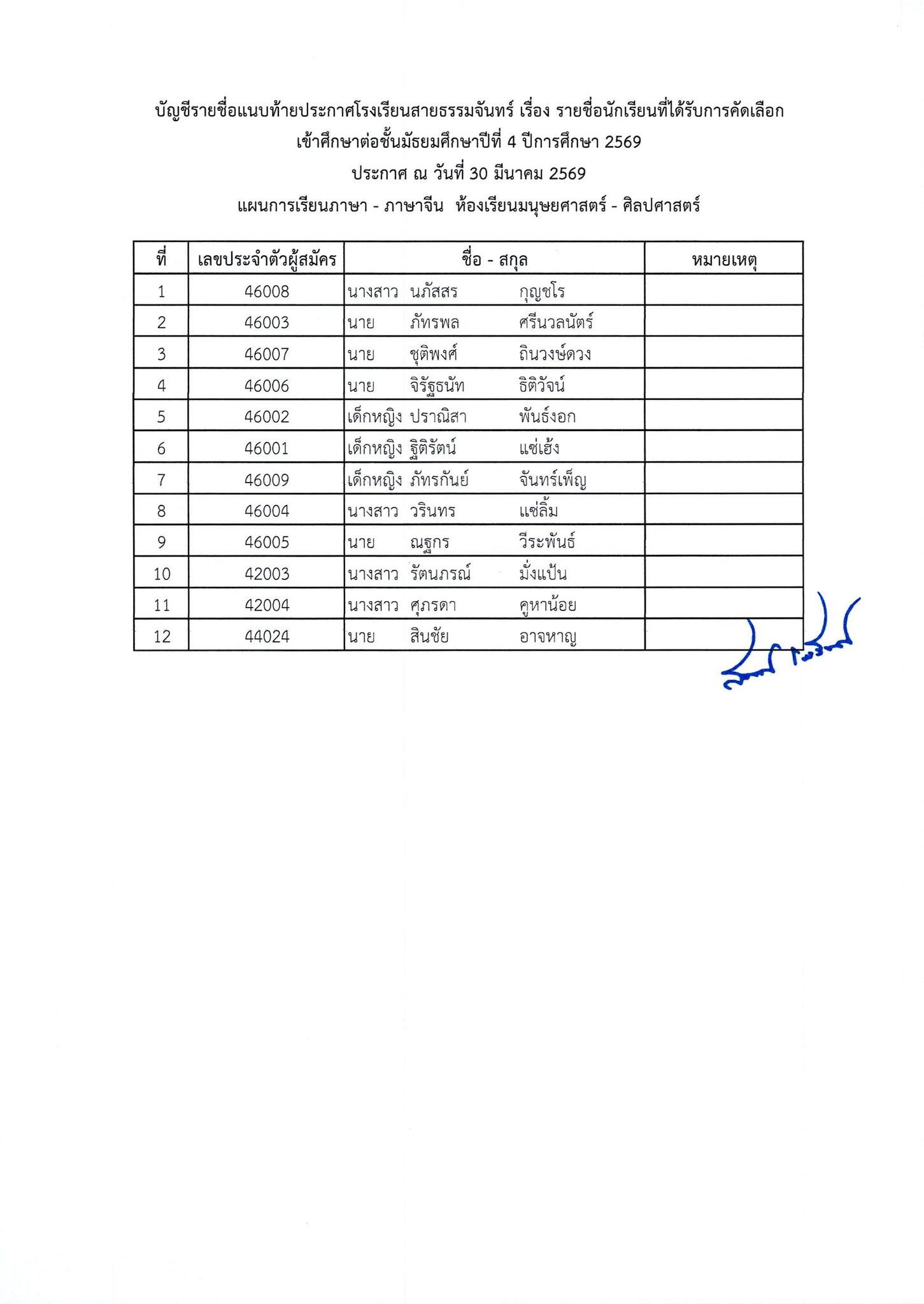 ประกาศผลการสอบคัดเลือกนักเรียนเข้าศึกษาต่อ ชั้นมัธยมศึกษาปีที่ 4 ห้องเรียนทั่วไป ปีการศึกษา 2569