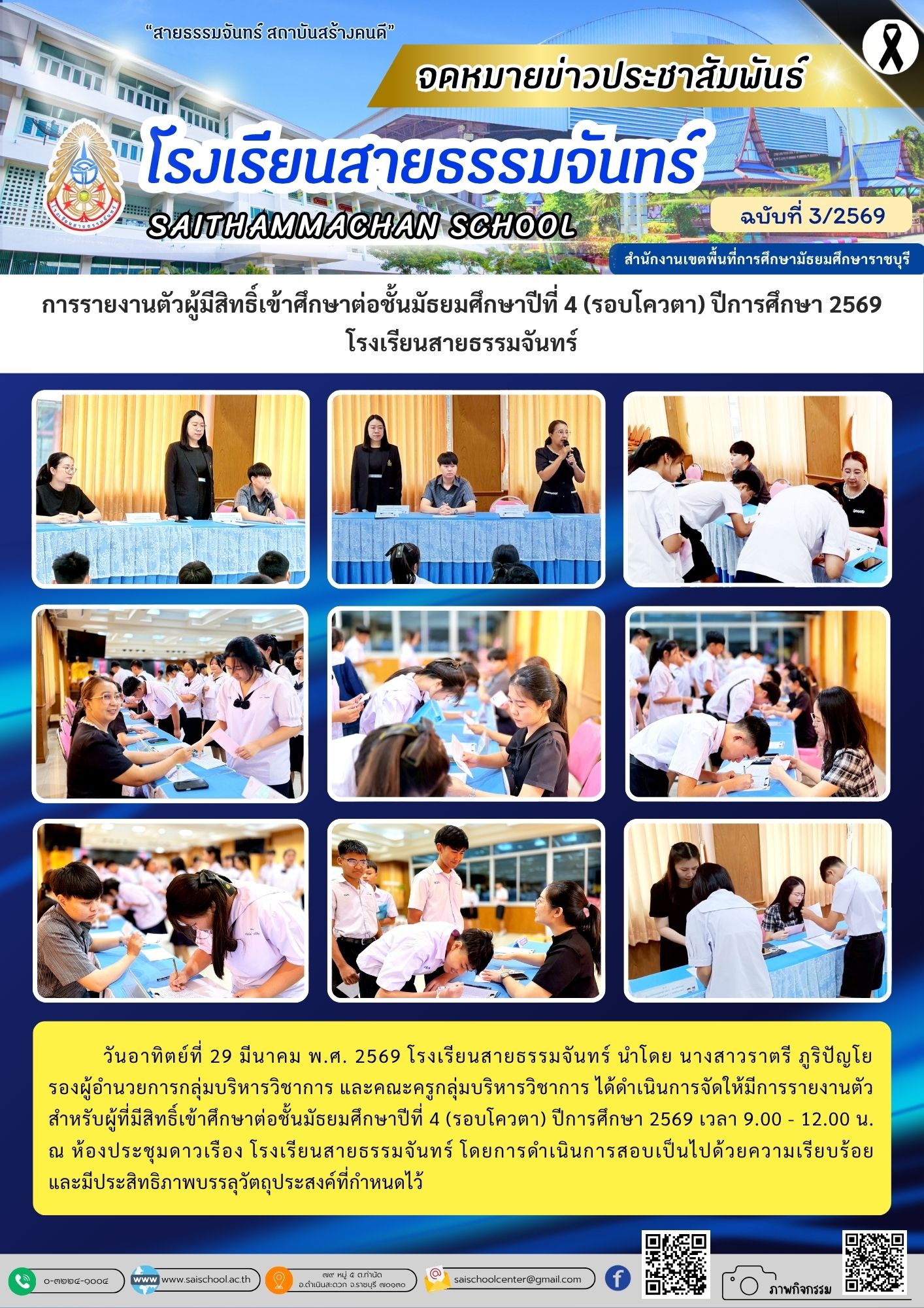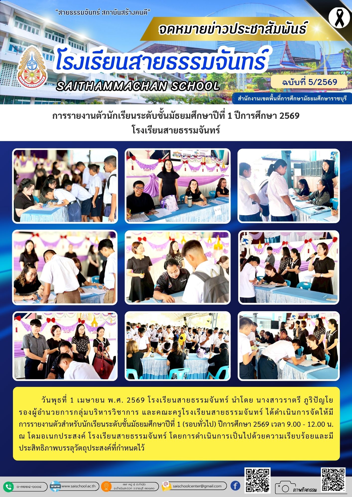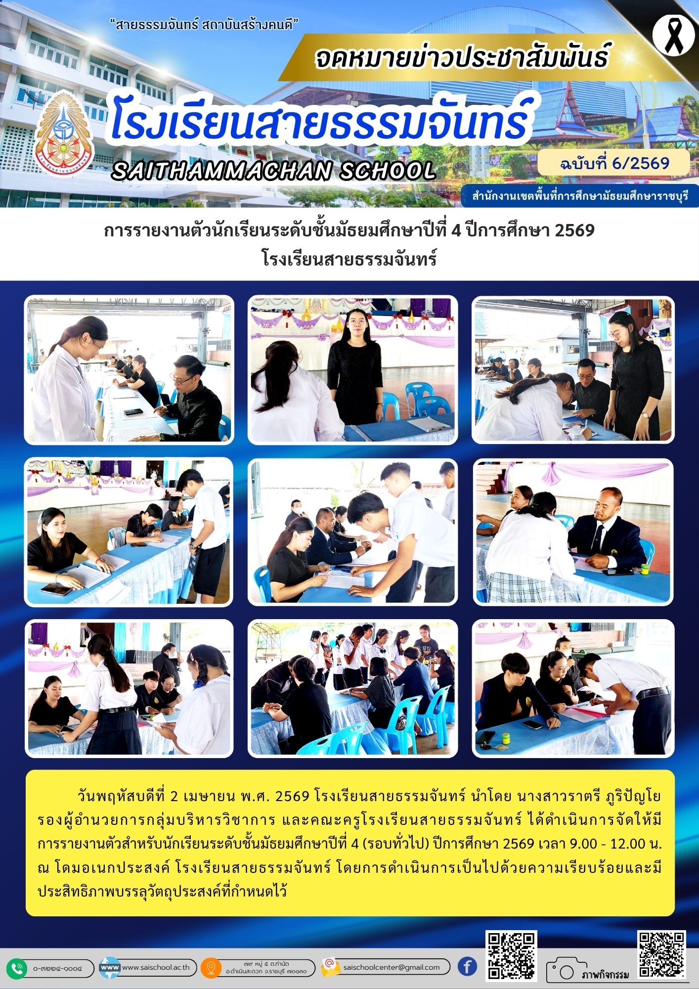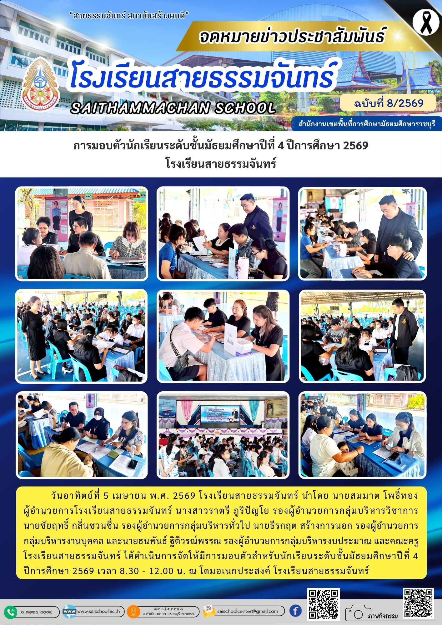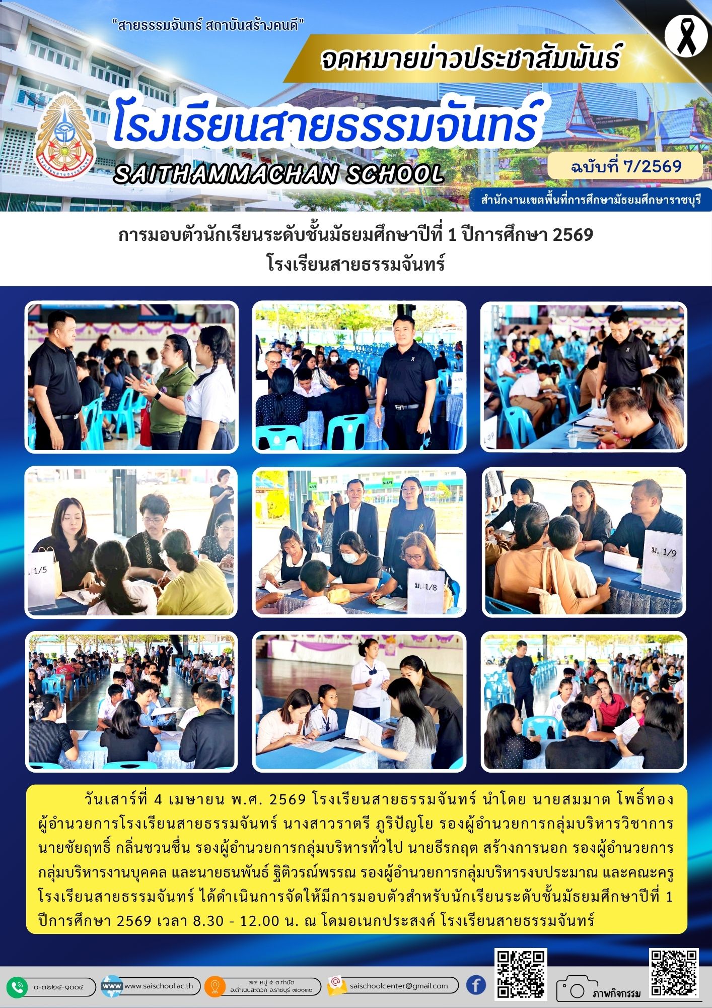 วันเสาร์ที่ 4 เมษายน พ.ศ. 2569 โรงเรียนสายธรรมจันทร์ นำโดย นายสมมาต โพธิ์ทอง ผู้อำนวยการโรงเรียนสายธรรมจันทร์ นางสาวราตรี ภูริปัญโย รองผู้อำนวยการกลุ่มบริหารวิชาการ นายชัยฤทธิ์ กลิ่นชวนชื่น รองผู้อำนวยการกลุ่มบริหารทั่วไป นายธีรกฤต สร้างการนอก รองผู้อำนวยการ กลุ่มบริหารงานบุคคล และนายธนพันธ์ ฐิติวรณ์พรรณ รองผู้อำนวยการกลุ่มบริหารงบประมาณ และคณะครู โรงเรียนสายธรรมจันทร์ ได้ดำเนินการจัดให้มีการมอบตัวสำหรับนักเรียนระดับชั้นมัธยมศึกษาปีที่ 1 ปีการศึกษา 2569 เว(อ่านต่อ)