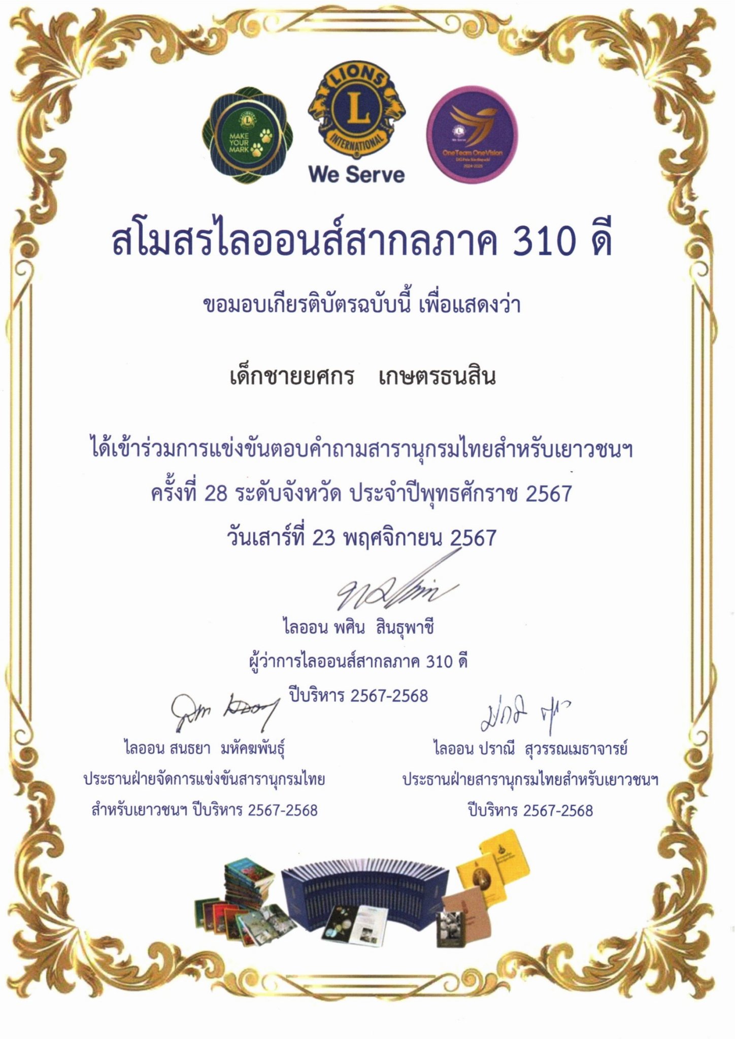 เด็กชายยศกร เกษตรธนสินเข้าร่วมการแข่งขันตอบคำถามสารานุกรมไทยสำหรับเยาวชนฯ ครั้งที่ 28 ระดับจังหวัด ประจำปีพุทธศักราช 2567