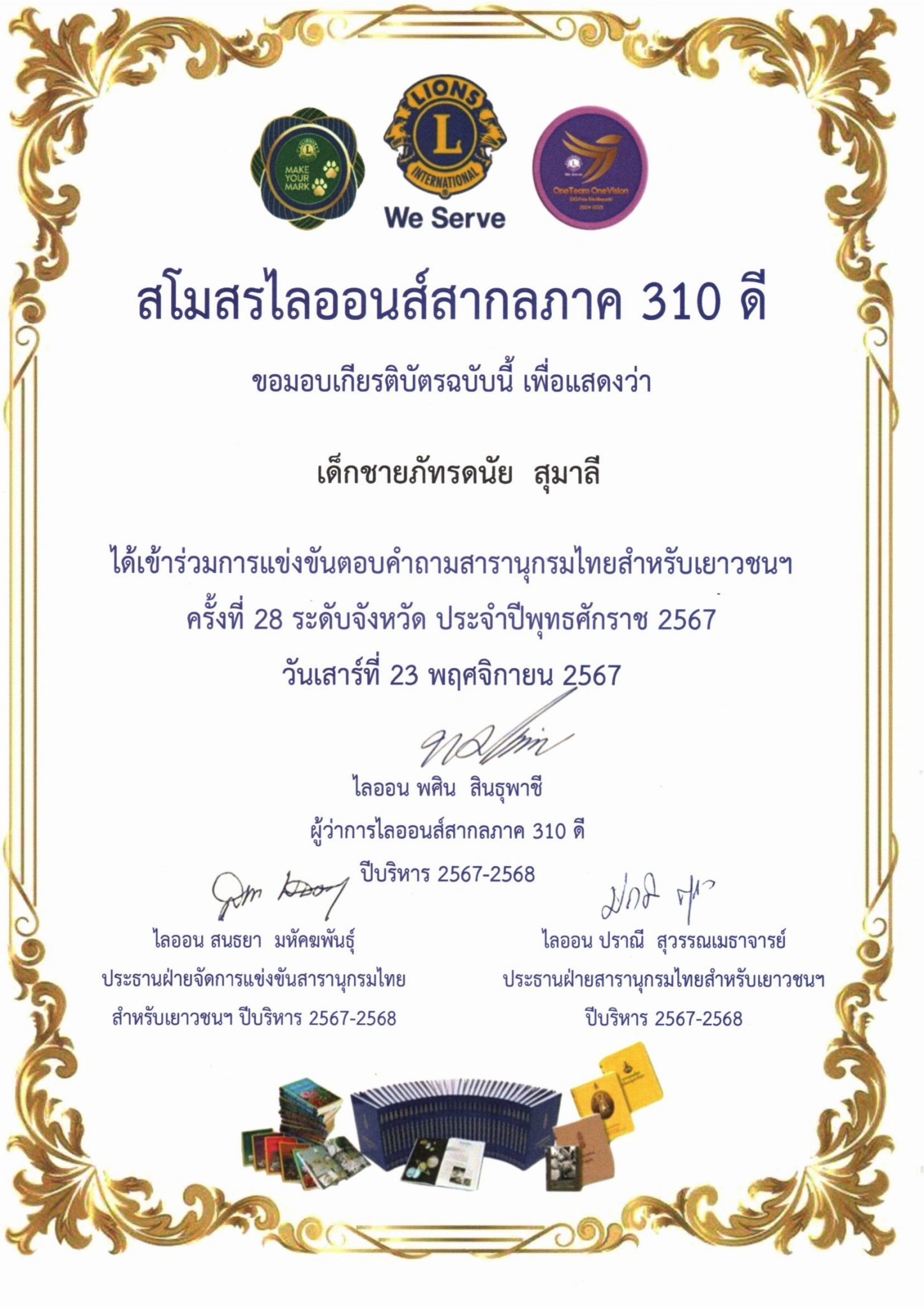 เด็กชายภัทรดนัย สุมาลีเข้าร่วมการแข่งขันตอบคำถามสารานุกรมไทยสำหรับเยาวชนฯ ครั้งที่ 28 ระดับจังหวัด ประจำปีพุทธศักราช 2567