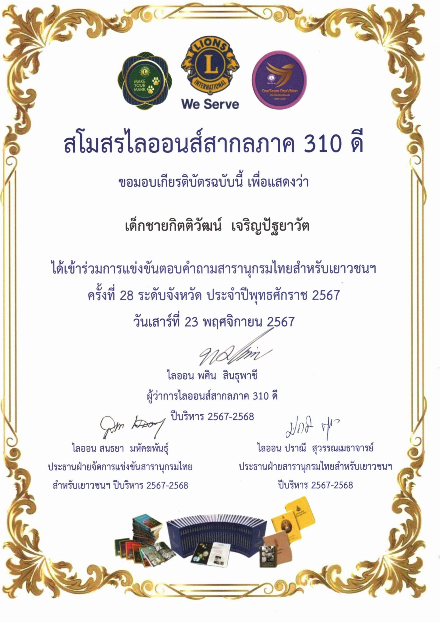 เด็กชายกิตติวัฒน์ เจริญปัฐยาวัตเข้าร่วมการแข่งขันตอบคำถามสารานุกรมไทยสำหรับเยาวชนฯ ครั้งที่ 28 ระดับจังหวัด ประจำปีพุทธศักราช 2567