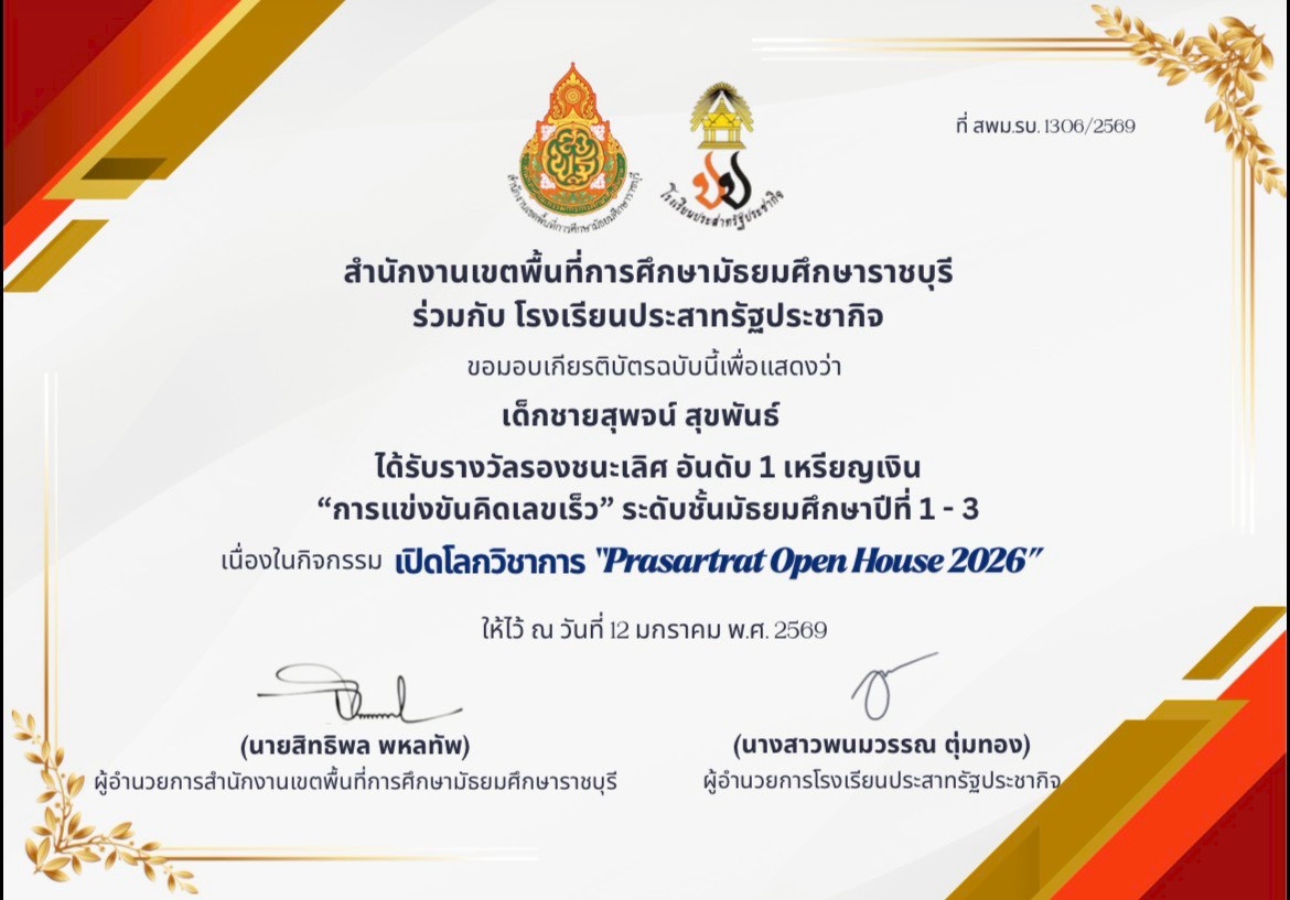 เด็กชายสุพจน์ สุขพันธ์รางวัลรองชนะเลิศ อันดับ 1 เหรียญเงิน การแข่งขันคิดเลขเร็ว ระดับชั้นมัธยมศึกษาปีที่ 1-3