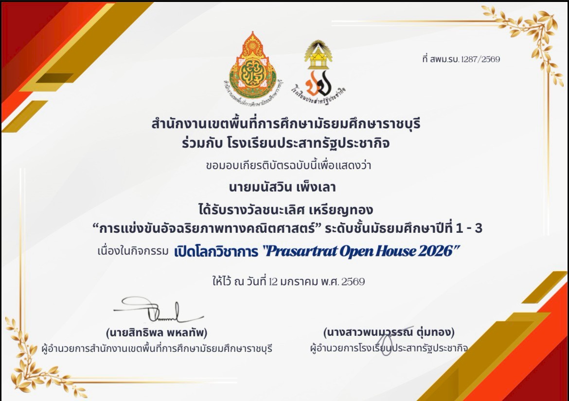 นายมนัสวิน เพ็งเลารางวัลชนะเลิศระดับเหรียญทอง การแข่งขันอัจฉริยภาพทางคณิตศาสตร์ ระดับชั้นมัธยมศึกษาปีที่ 1-3