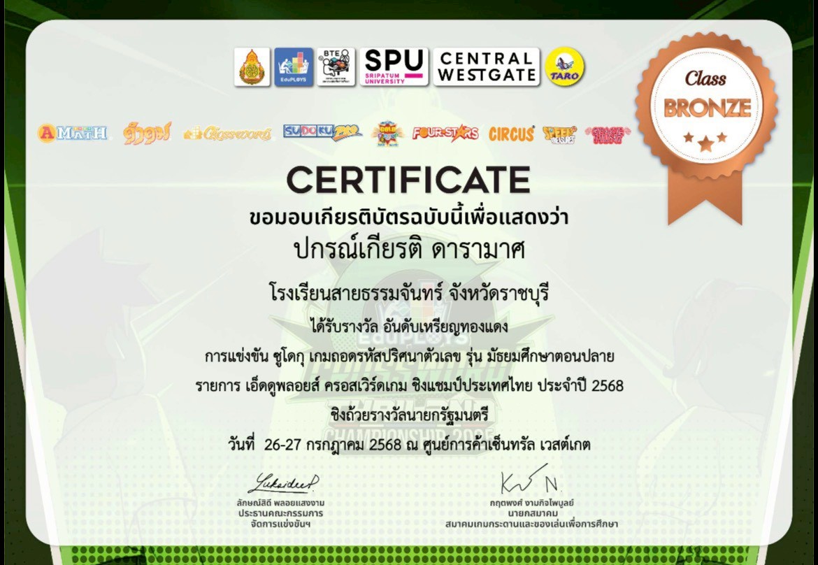 นายปกรณ์เกียรติ ดารามาศอันดับเหรียญทองแดง การแข่งขันซูโดกุ เกมถอดรหัสปริศนาตัวเลข รุ่น มัธยมศึกษาตอนปลาย