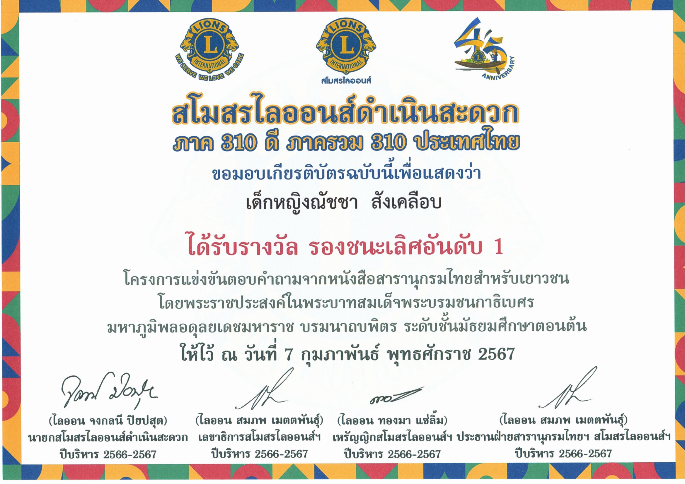เด็กหญิงณัชชา สังเคลือบได้รับรางวัล รองชนะเลิศอันดับ 1 การแข่งขันตอบคำถามจากหนังสือสารานุกรมไทยสำหรับเยาวชน โดยพระราชประสงค์ในพระบาทสมเด็จพระบรมชนกาธิเบศร มหาภูมิพลอดุยเดชมหาราช บรมนาถบพิตร ระดับการศึกษาขั้นพื้นฐาน