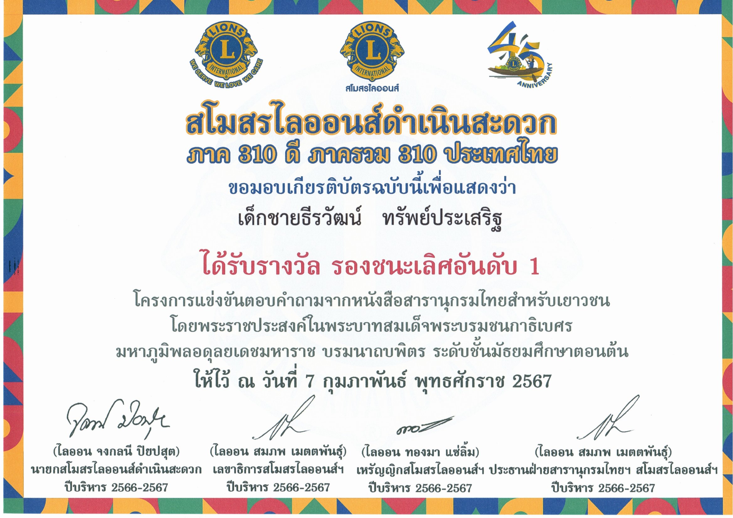 เด็กหญิงธีรวัฒน์ ทรัพย์ประเสริฐได้รับรางวัล รองชนะเลิศอันดับ 1 การแข่งขันตอบคำถามจากหนังสือสารานุกรมไทยสำหรับเยาวชน โดยพระราชประสงค์ในพระบาทสมเด็จพระบรมชนกาธิเบศร มหาภูมิพลอดุยเดชมหาราช บรมนาถบพิตร ระดับการศึกษาขั้นพื้นฐาน