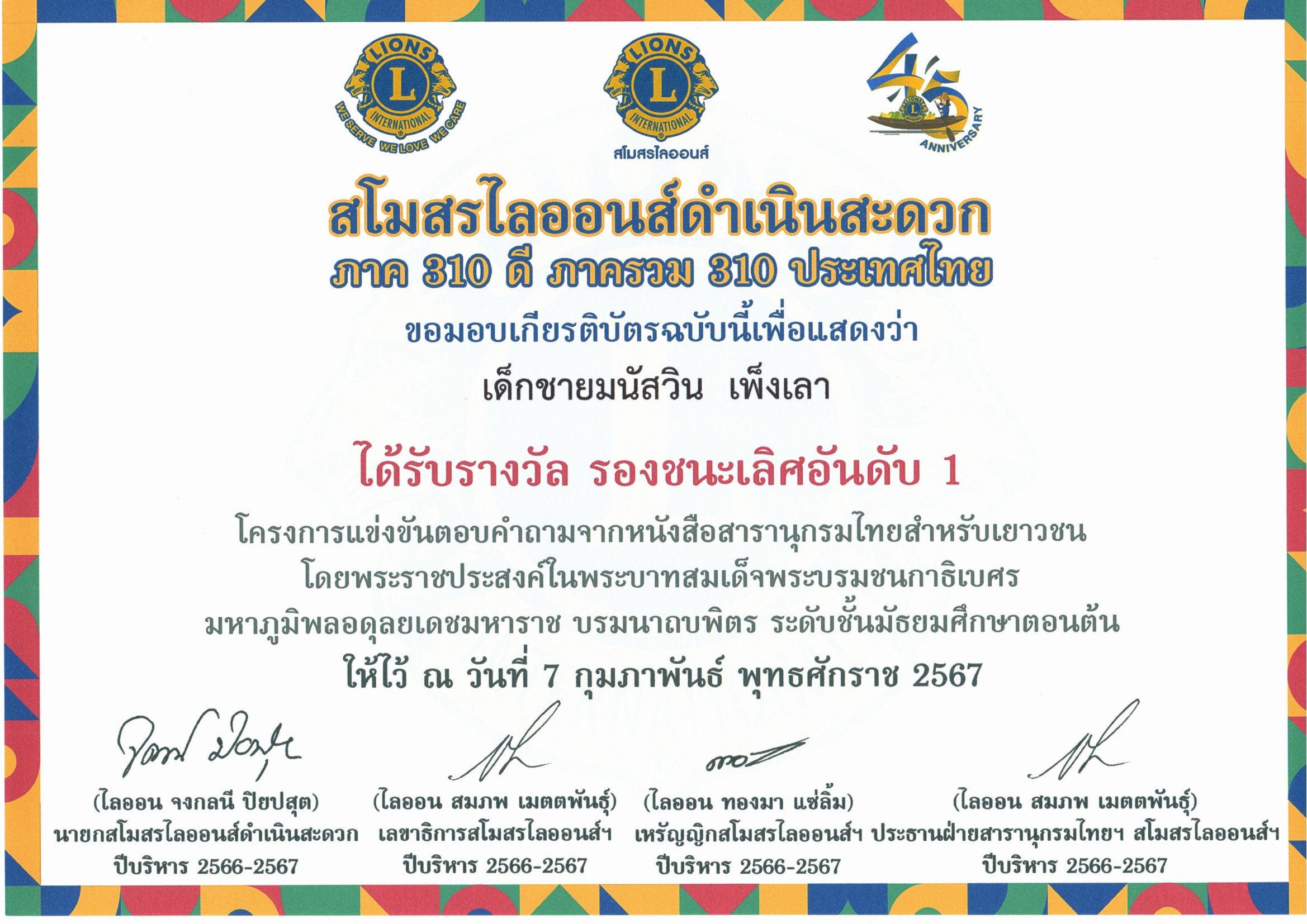 เด็กชายมนัสวิน เพ็งเลาได้รับรางวัล รองชนะเลิศอันดับ 1 การแข่งขันตอบคำถามจากหนังสือสารานุกรมไทยสำหรับเยาวชน โดยพระราชประสงค์ในพระบาทสมเด็จพระบรมชนกาธิเบศร มหาภูมิพลอดุยเดชมหาราช บรมนาถบพิตร ระดับการศึกษาขั้นพื้นฐาน