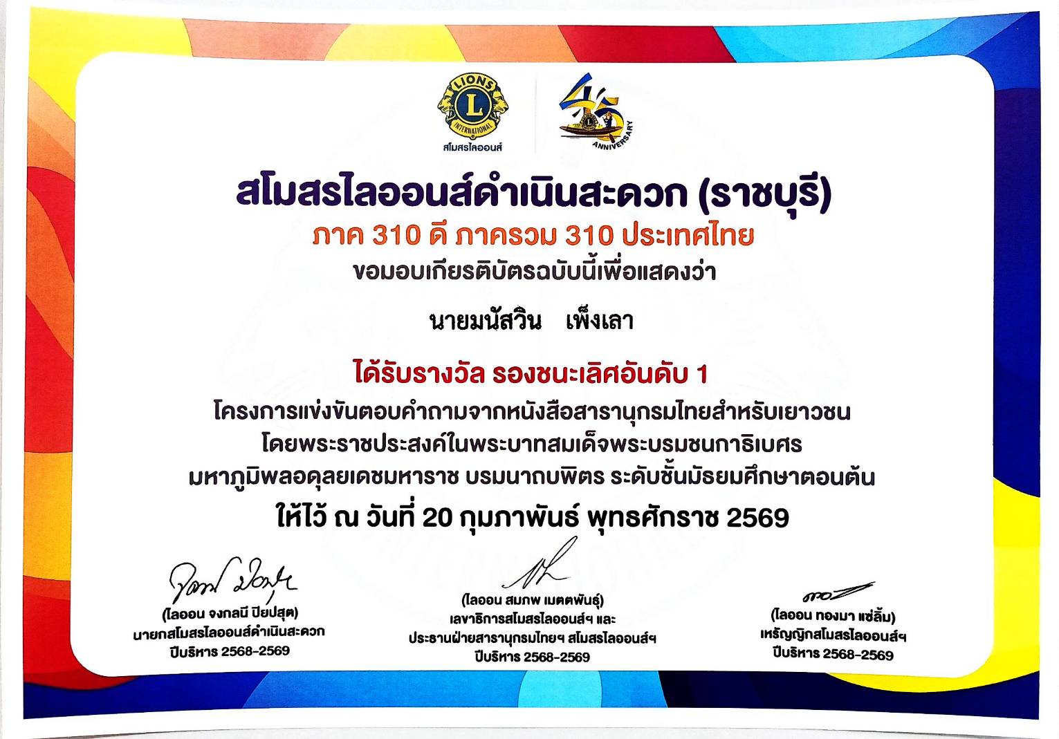 นายมนัสวิน เพ็งเลารางวัลรองชนะเลิศอันดับ 1 การแข่งขันตอบคำถามสารานุกรมไทยสำหรับเยาวชน