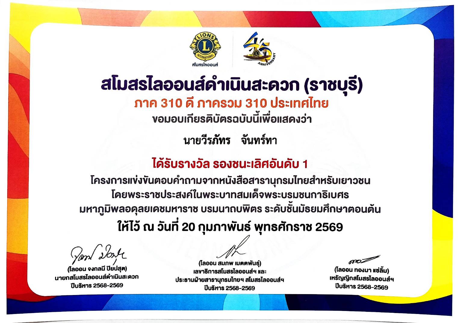 เด็กชายธีรวัฒน์ ทรัพย์ประเสริฐรางวัลรองชนะเลิศอันดับ 1 การแข่งขันตอบคำถามสารานุกรมไทยสำหรับเยาวชน