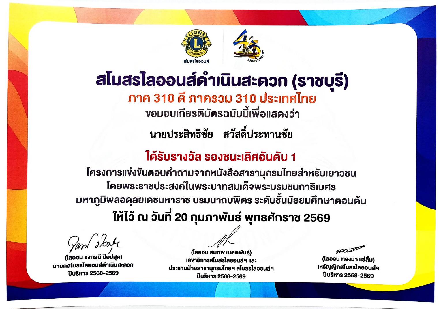 นายประสิทธชัย สวัสดิ์ประทานชัยรางวัลรองชนะเลิศอันดับ 1 การแข่งขันตอบคำถามสารานุกรมไทยสำหรับเยาวชน