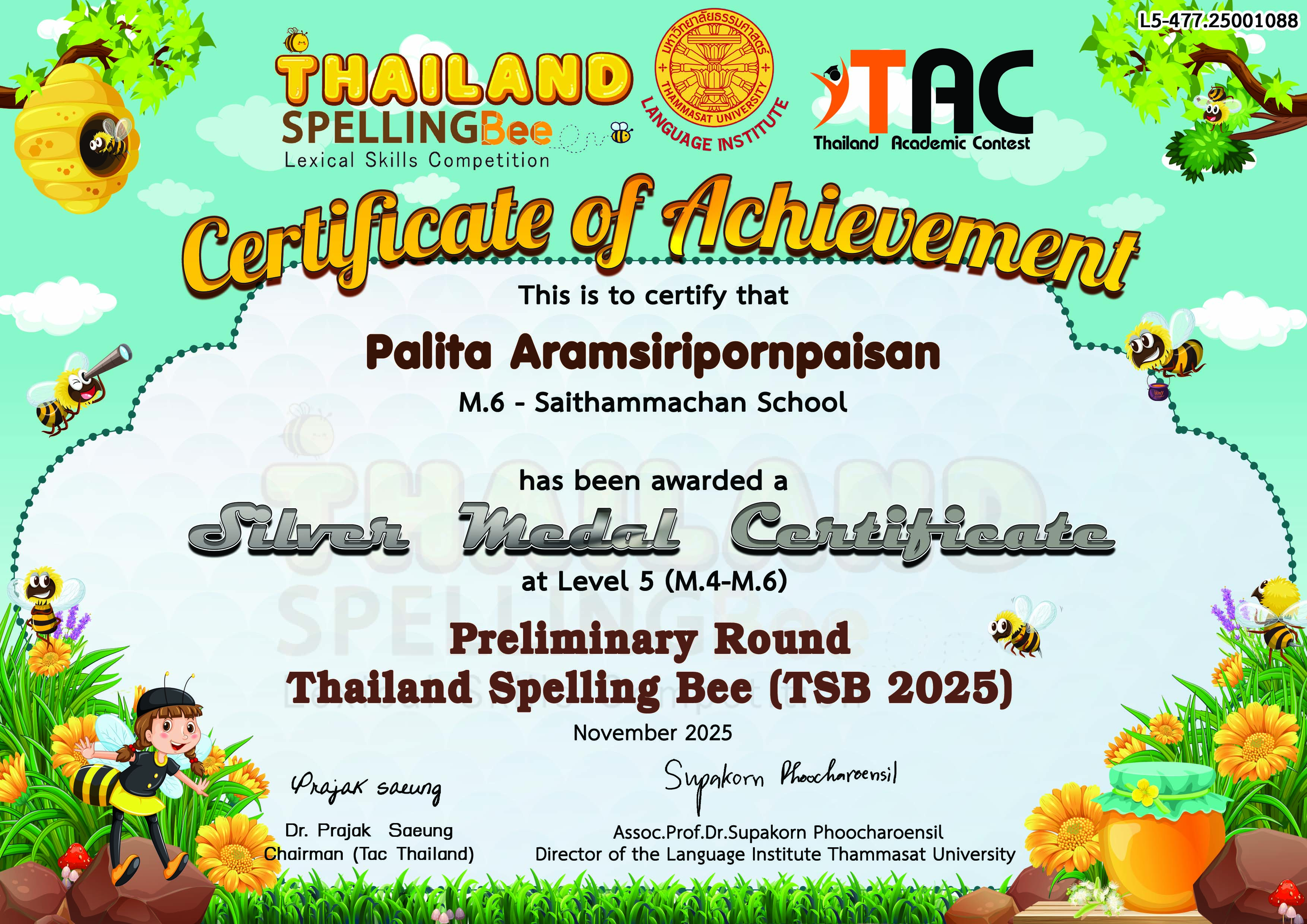 นางสาวปาลิตา อร่ามสิริพรไพศาลรางวัลระดับเหรียญเงิน การแข่งขัน Thailand Spelling Bee 2025 รอบคัดเลือก