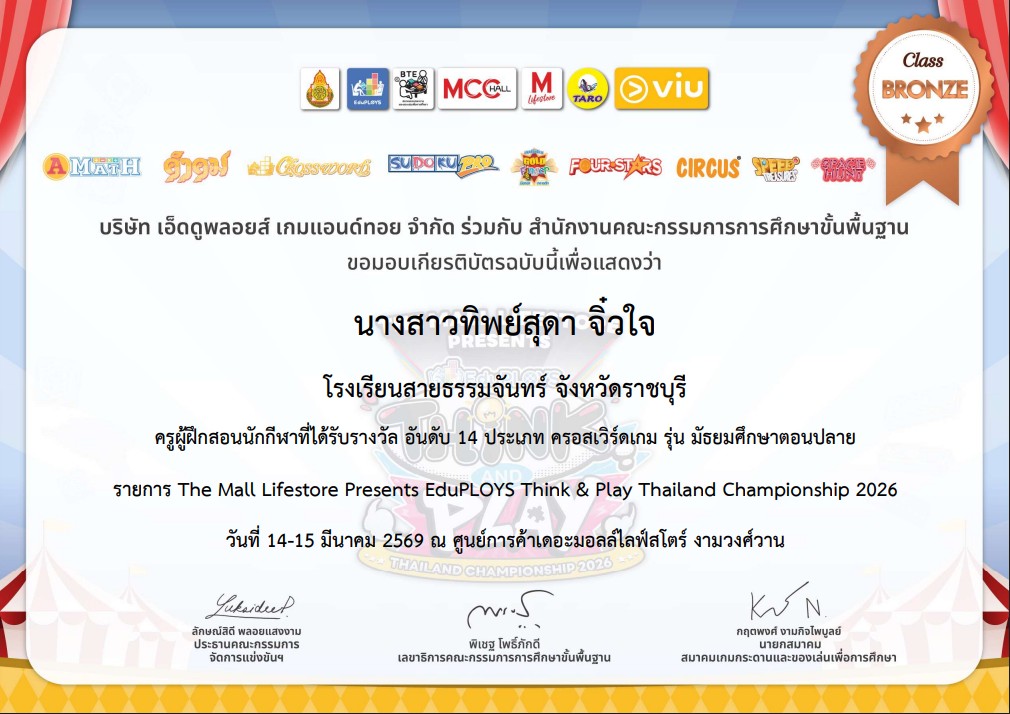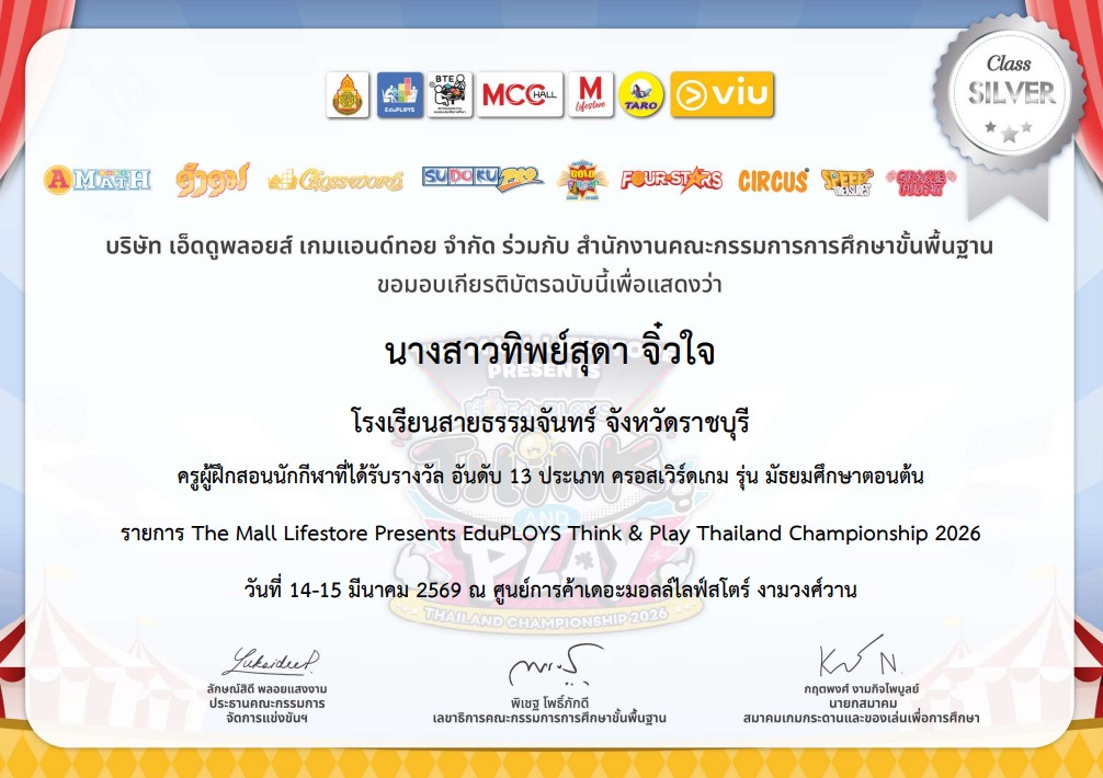 นางสาวทิพย์สุดา จิ๋วใจครูผู้ฝึกซ้อมนักกีฬาที่ได้รางวัลระดับเหรียญเงิน อันดับที่ 13 การแข่งขันครอสเวิร์ดเกม รุ่น ม.ต้น รายการ Eduploys Think & Play Thailand Championship 2026