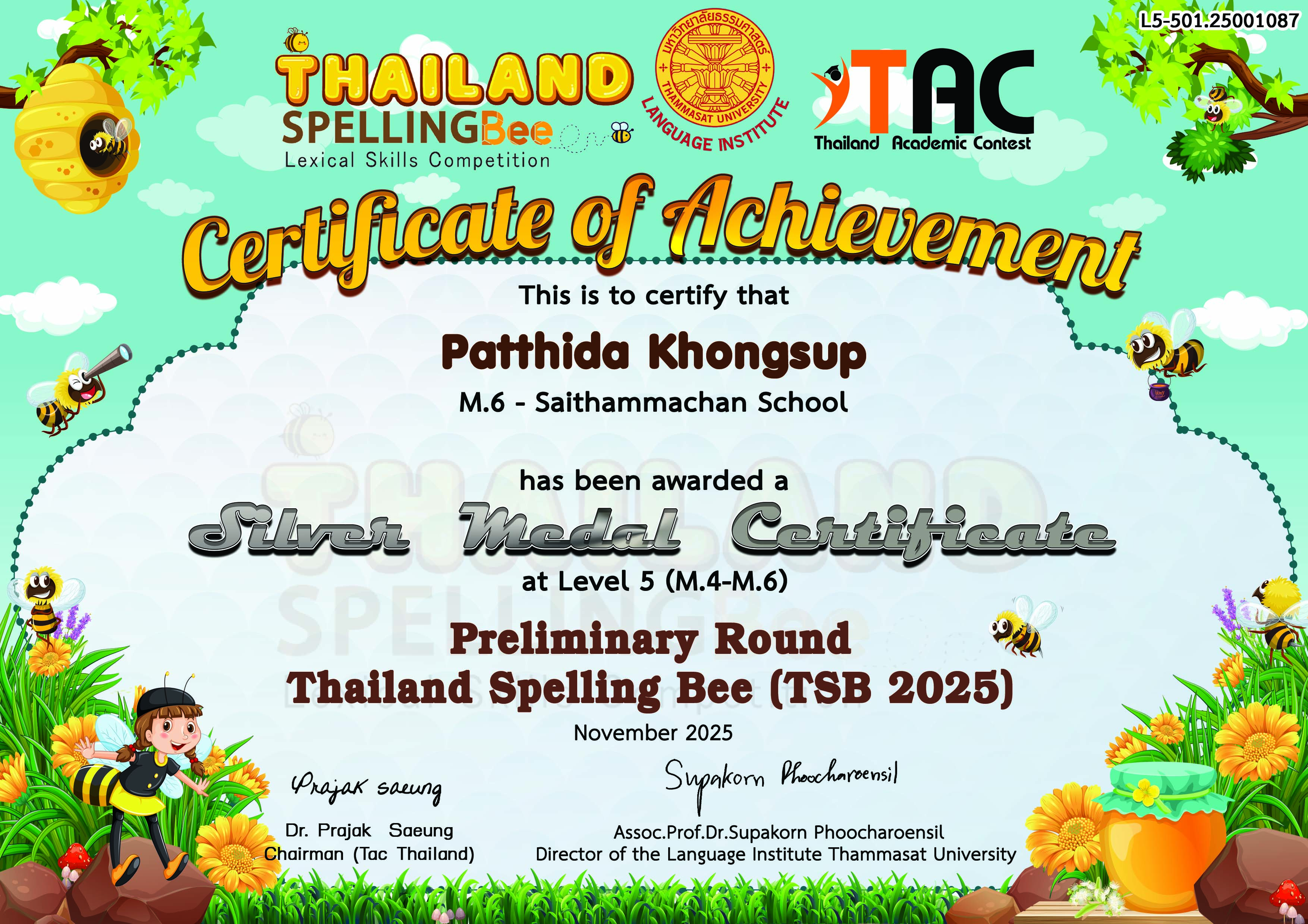 นางสาวภัทรธิดา คงทรัพย์รางวัลระดับเหรียญเงิน การแข่งขัน Thailand Spelling Bee 2025 รอบคัดเลือก