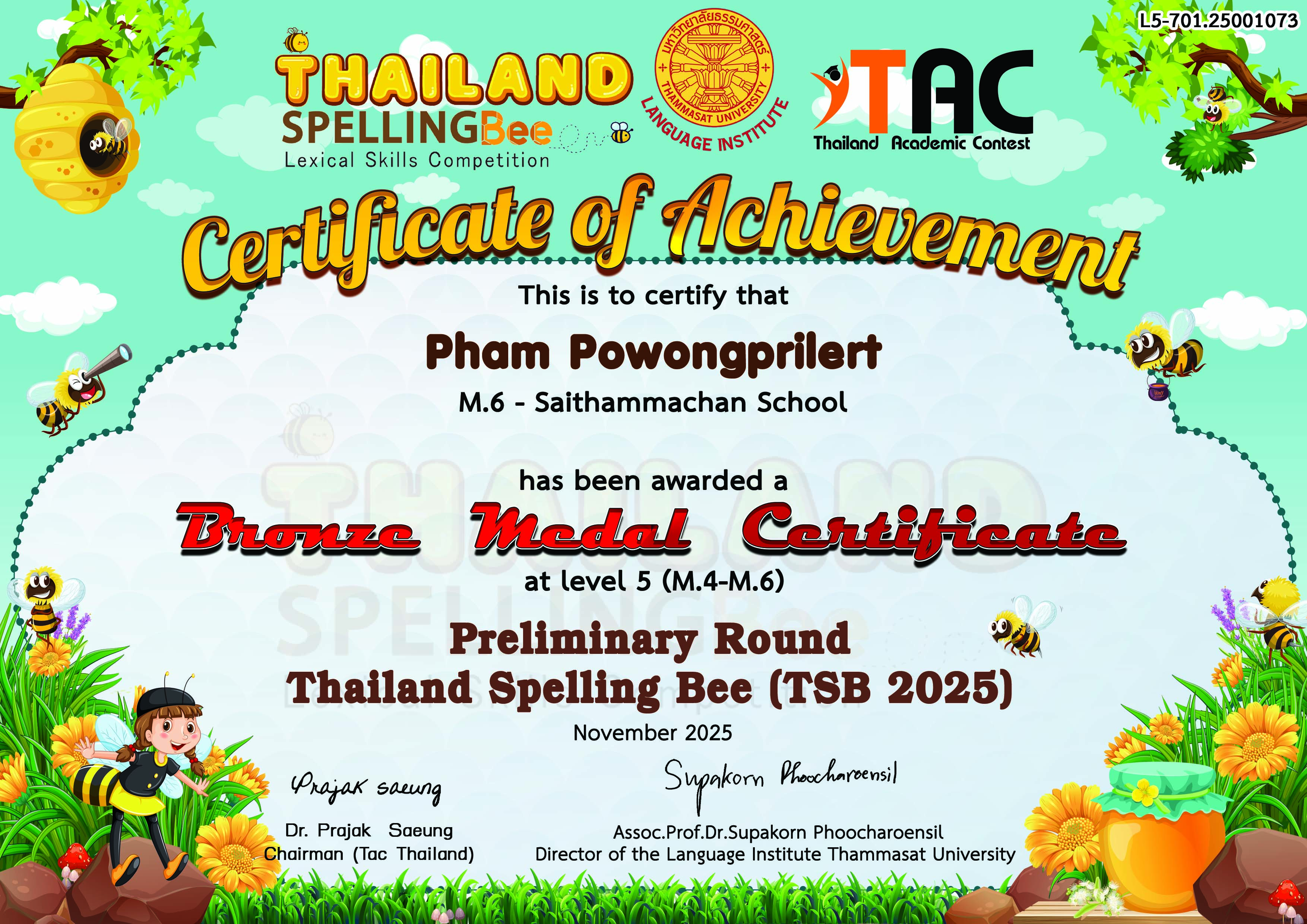 นายภาม โพธิ์วงศ์ไพรเลิศรางวัลระดับเหรียญทองแดง การแข่งขัน Thailand Spelling Bee 2025 รอบคัดเลือก