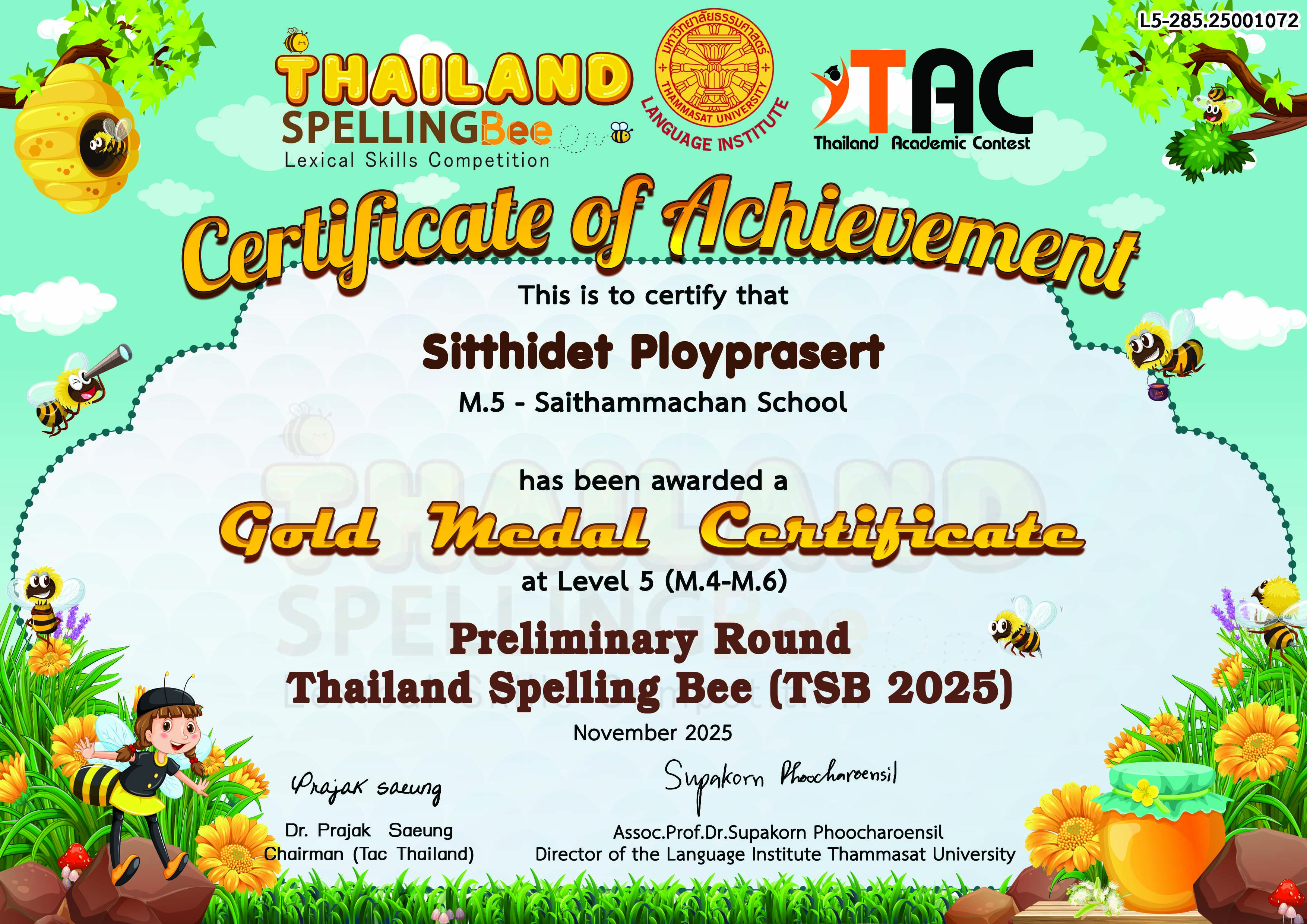 นายสิทธิเดช พลอยประเสริฐรางวัลระดับเหรียญทอง การแข่งขัน Thailand Spelling Bee 2025 รอบคัดเลือก