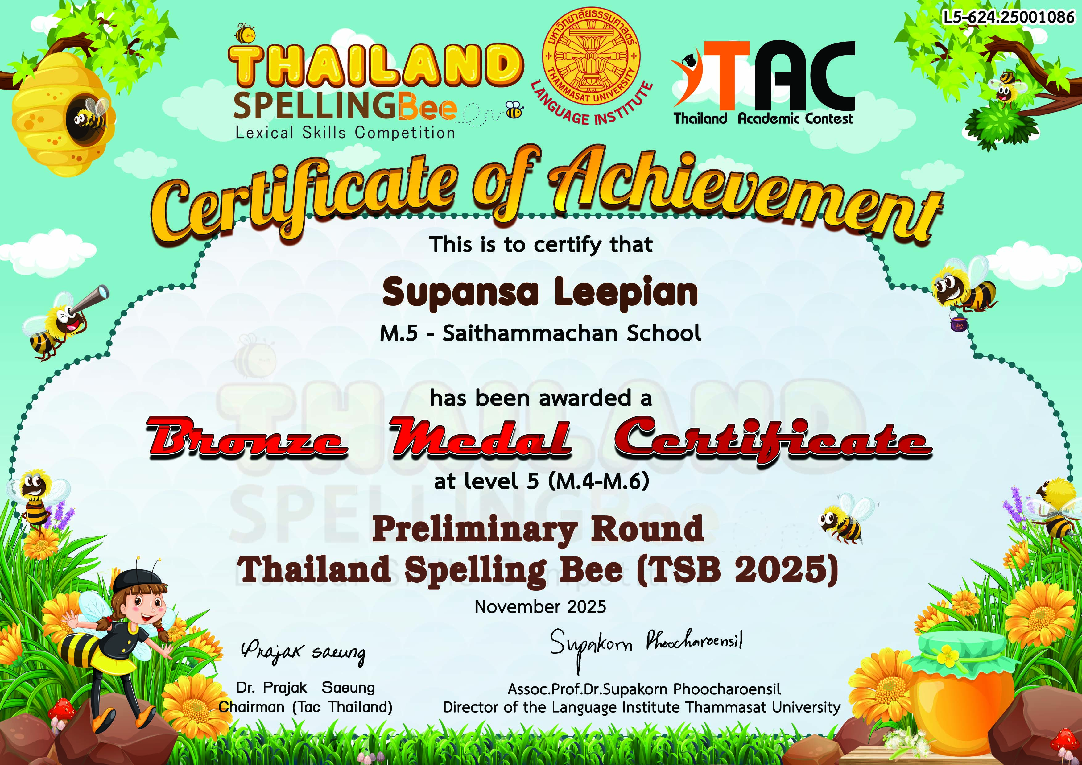 นางสาวสุพรรษา ลี้เปลี่ยนรางวัลระดับเหรียญทองแดง การแข่งขัน Thailand Spelling Bee 2025 รอบคัดเลือก