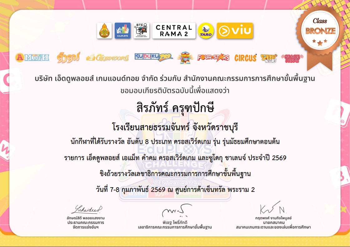 เด็กชายสิรภัทร์ ครุฑปักษีรางวัลอันดับที่ 8 เหรียญทองแดง การแข่งขันครอสเวิร์ดเกม ระดับ ม.ต้น