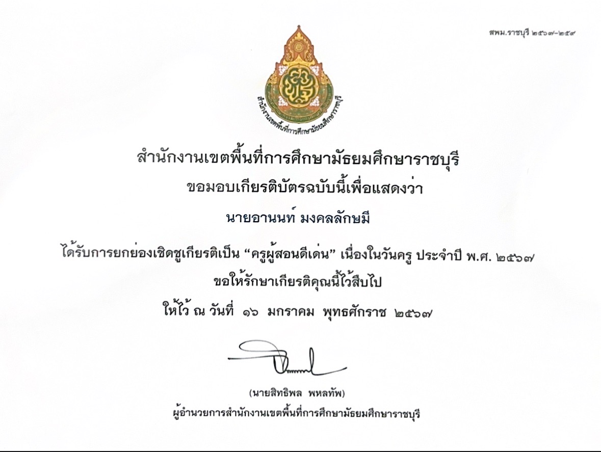 นายอานนท์ มงคลลักษมี"ครูผู้สอนดีเด่น" เนื่องในวันครู ประจำปี พ.ศ.2567