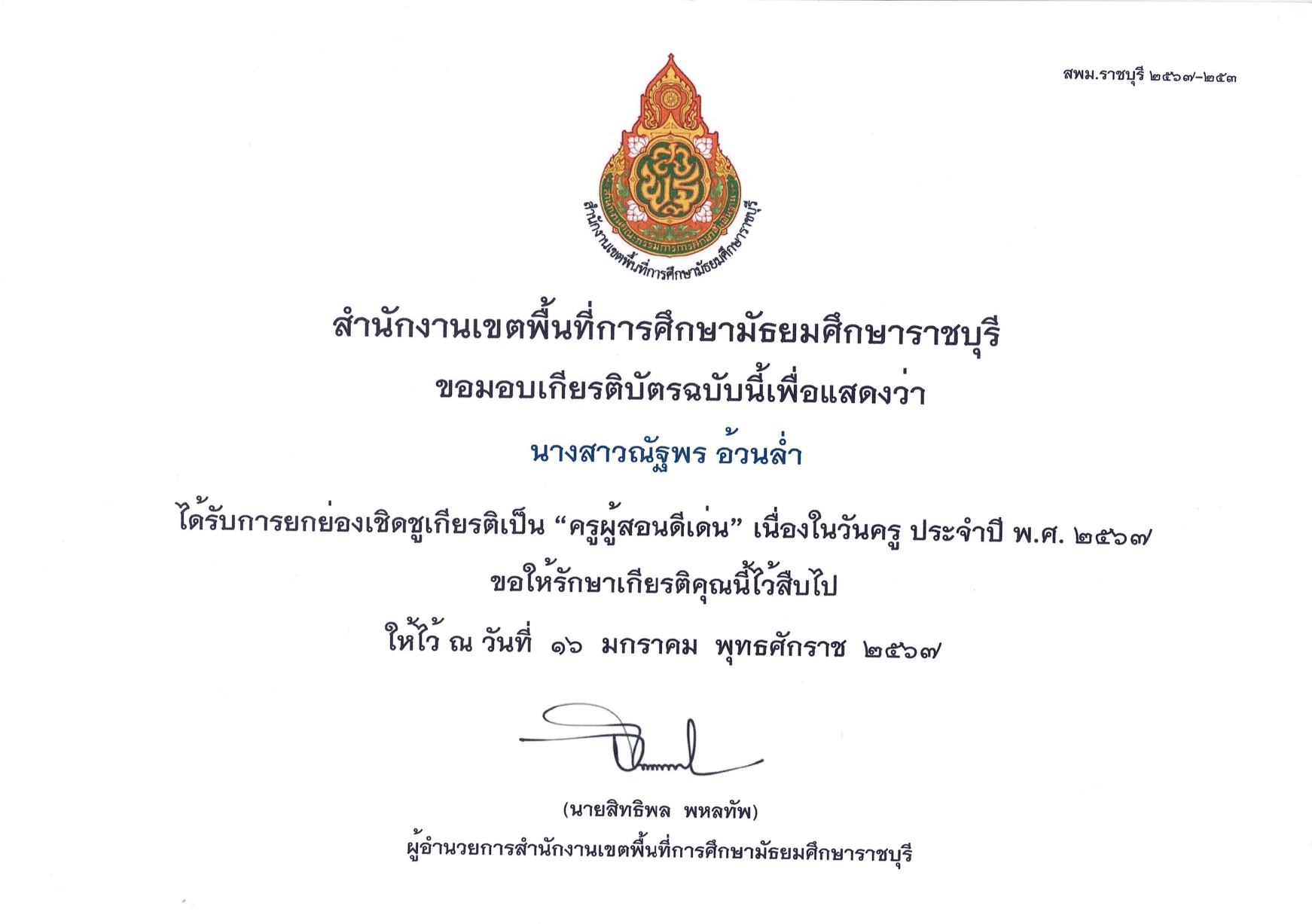 นางสาวสุภณัชชา ภู่รักสกุลได้รับการยกย่องเชิดชูเกียรติเป็น "ครูผู้สอนดีเด่น" เนื่องในวันครู ประจำปี พ.ศ.2567