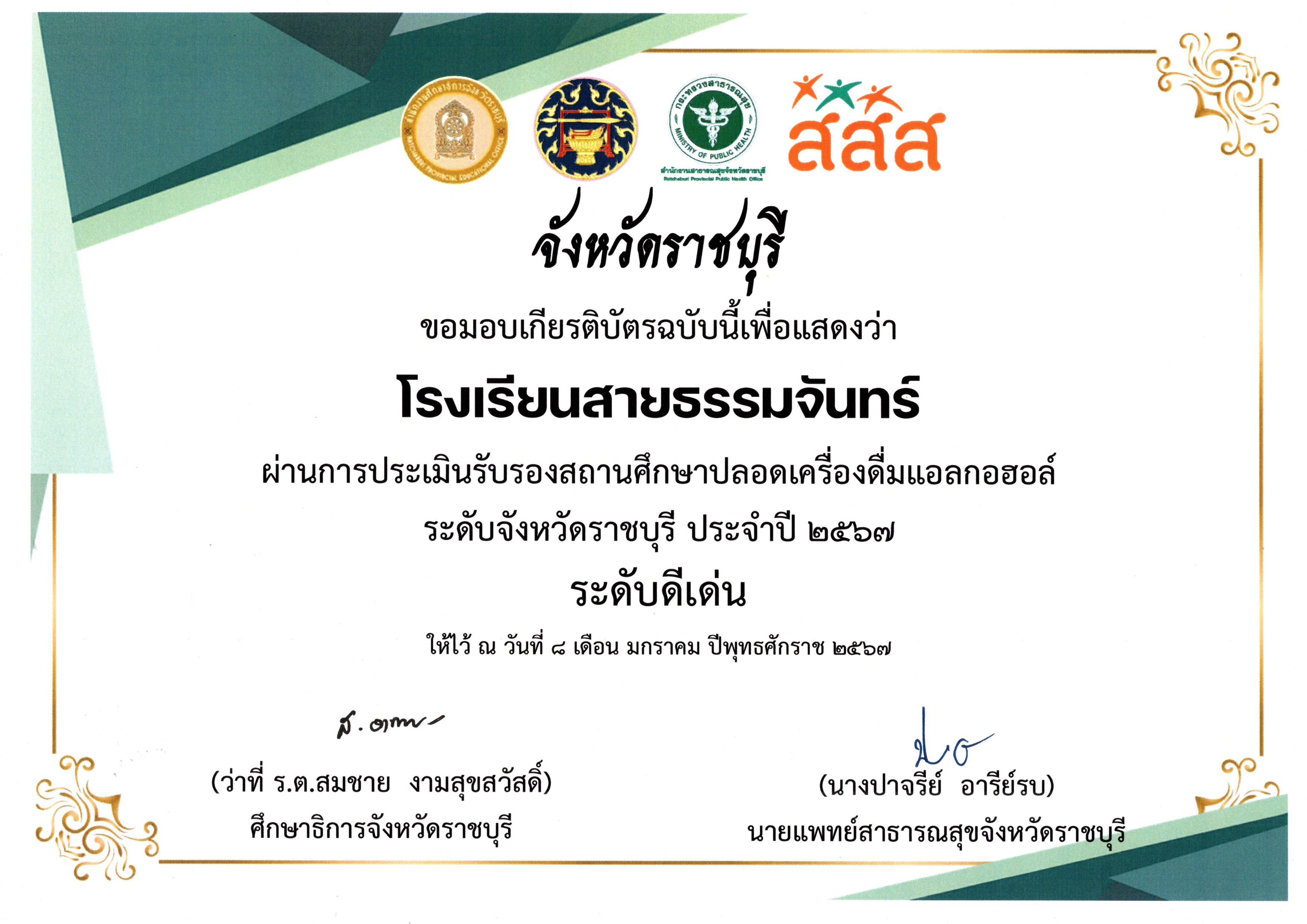 โรงเรียนสายธรรมจันทร์ผ่านการประเมินรับรองสถานศึกษาปลอดเครื่องดื่มแอลกอฮอล์ ระดับจังหวัดราชบุรี ประจำปี 2567