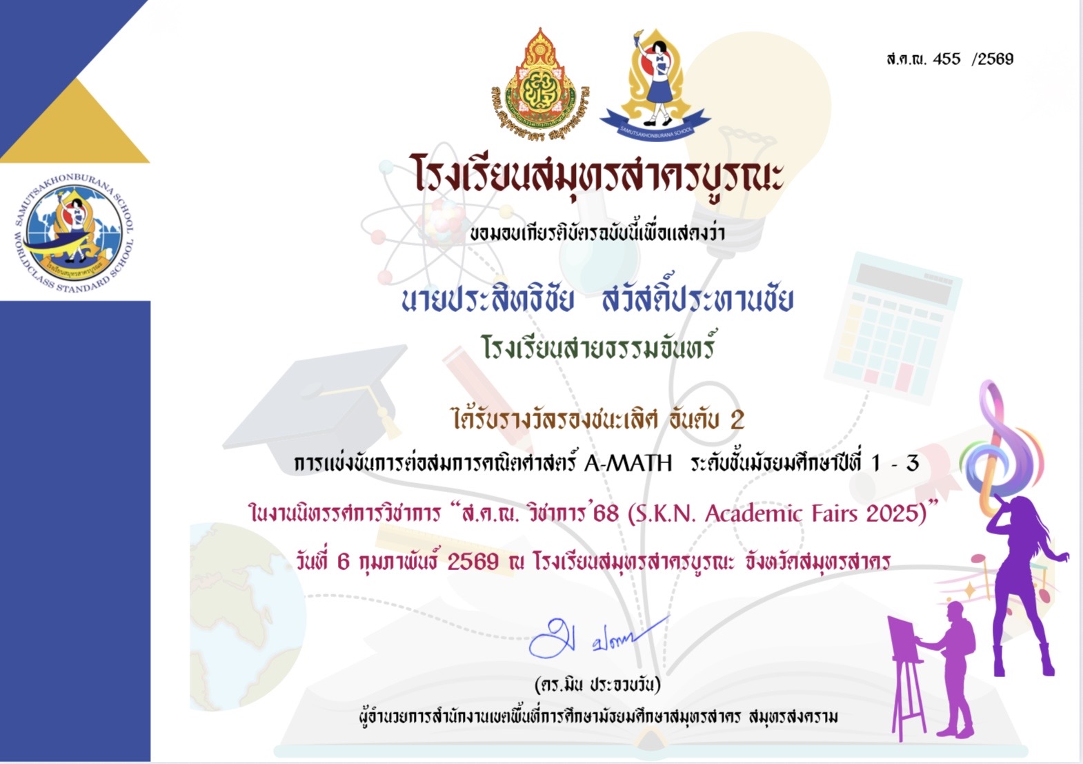 นายประสิทธิชัย สวัสดิ์ประทานชัยรางวัลรองชนะเลิศ อันดับ 2 การแข่งขันการต่อสมการคณิตศาสตร์ A-MATH ระดับชั้นมัธยมศึกษาปีที่ 1 - 3