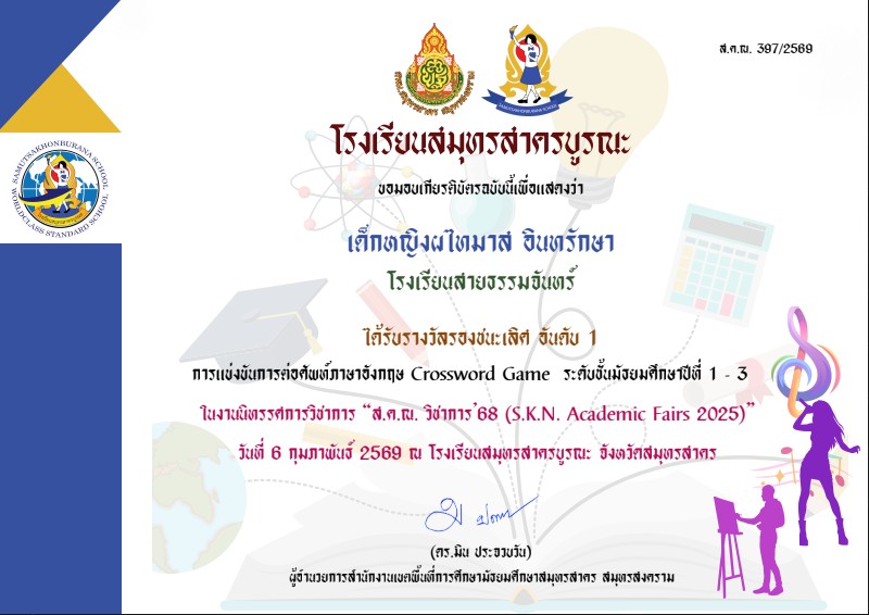 เด็กหญิงผไทมาส อินทรักษารางวัลรองชนะเลิศอันดับ 1 การแข่งขันครอสเวิร์ดเกม ระดับ ม.ต้น งาน ส.ค.ณ. เปิดบ้านวิชาการ ปี 2568
