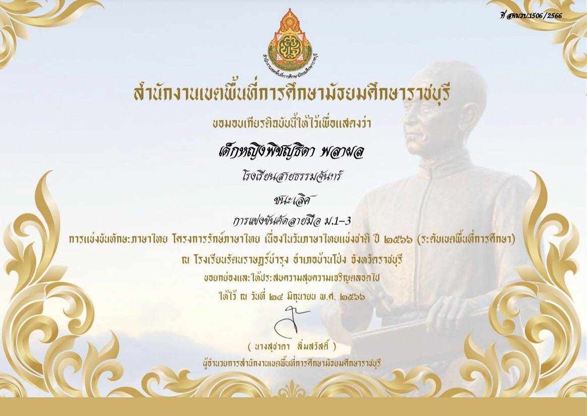 เด็กหญิงพิชญธิดา พลาผล ได้รับรางวัลชนะเลิศการแข่งขันคัดลายมือ ม.1-3 การแข่งขันทักษะภาษาไทย โครงการรักษ์ภาษาไทย เนื่องในวันภาษาไทยแห่งชาติ ปี 2566 ให้ไว้ ณ วันที่ 24 มิถุนายน พ.ศ.2566