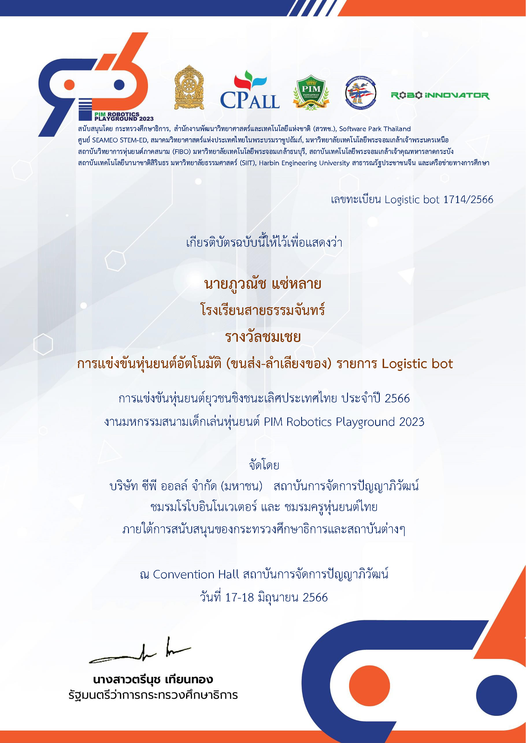 นายภูวณัช แซ่หลายรางวัลชมเชย การแข่งขันหุ่นยนต์อัตโนมัติ (ขนส่ง-ลำเลียงของ) รายการ Logistic bot การแข่งขันหุ่นยนต์ยุวชนชิงชนะเลิศประเทศไทย ประจำปี 2566 งานมหกรรมสนามเด็กเล่นหุ่นยนต์ PIM Robotics Playground 2023