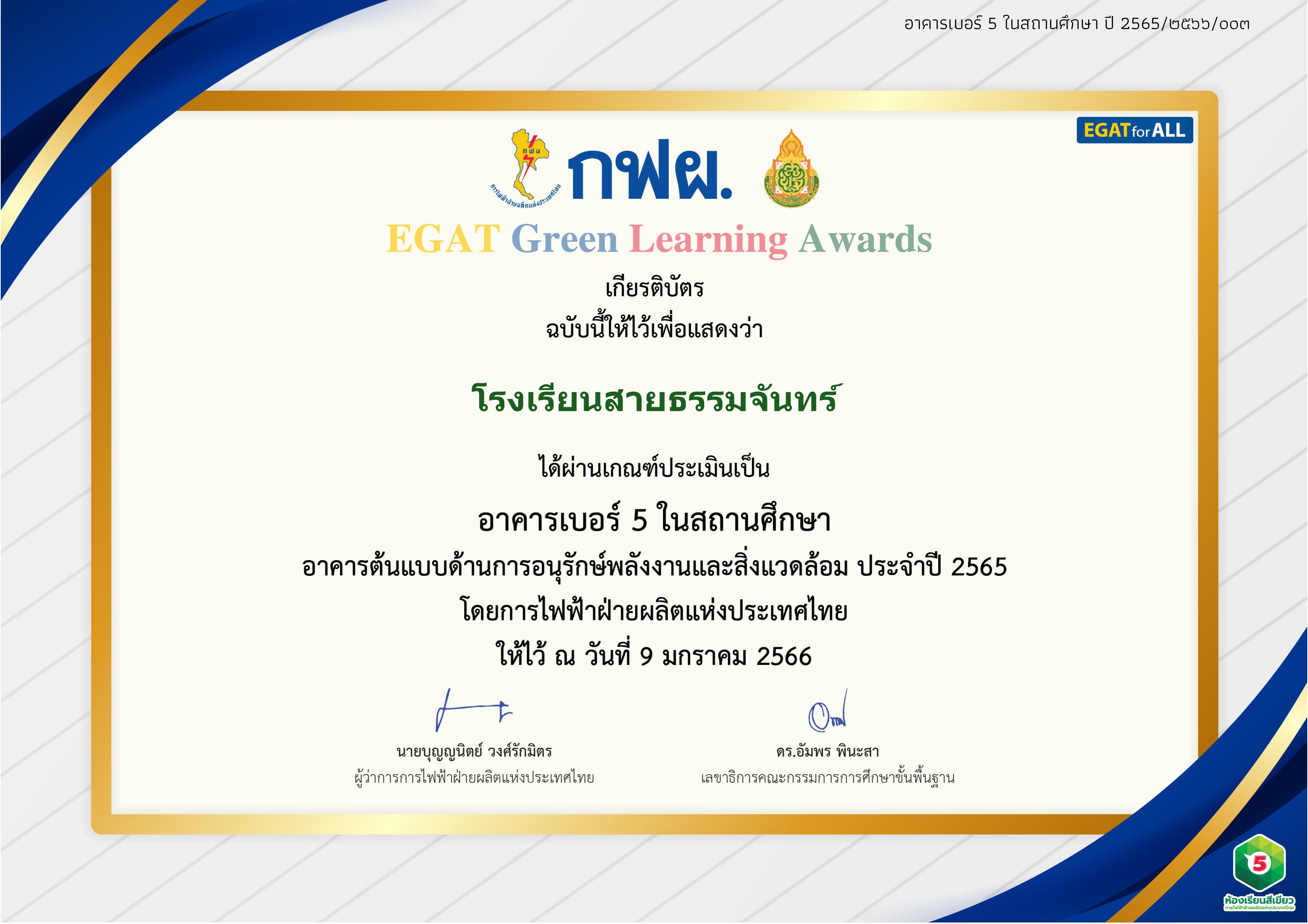 โรงเรียนสายธรรมจันทร์ผ่านเกณฑ์ประเมินเป็นอาคารเบอร์ 5 ในสถานศึกษา อาคารต้นแบบด้านการอนุรักษ์พลังงานและสิ่่งแวดล้อม ประจำปี 2565 โดยการไฟฟ้าฝ่ายผลิตแห่งประเทศไทย ให้ไว้ ณ วันที่ 9 มกราคม 2566