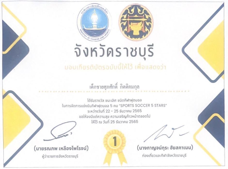 เด็กชายศุภศักดิ์ กิตติคมกุล ได้รับรางวัลชนะเลิศ การแข่งขันกีฬาฟุตบอล ในการจัดการแข่งขันกีฬาฟุตบอล 5 คน "SPORT SOCCER 5 STARS" ระหว่างวันที่ 22-25 ธันวาคม 2565