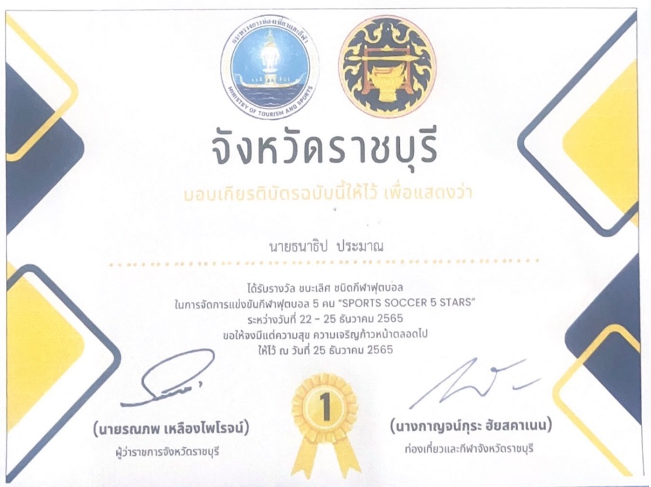นายธนาธิป ประมาณ ได้รับรางวัลชนะเลิศ การแข่งขันกีฬาฟุตบอล ในการจัดการแข่งขันกีฬาฟุตบอล 5 คน "SPORT SOCCER 5 STARS" ระหว่างวันที่ 22-25 ธันวาคม 2565