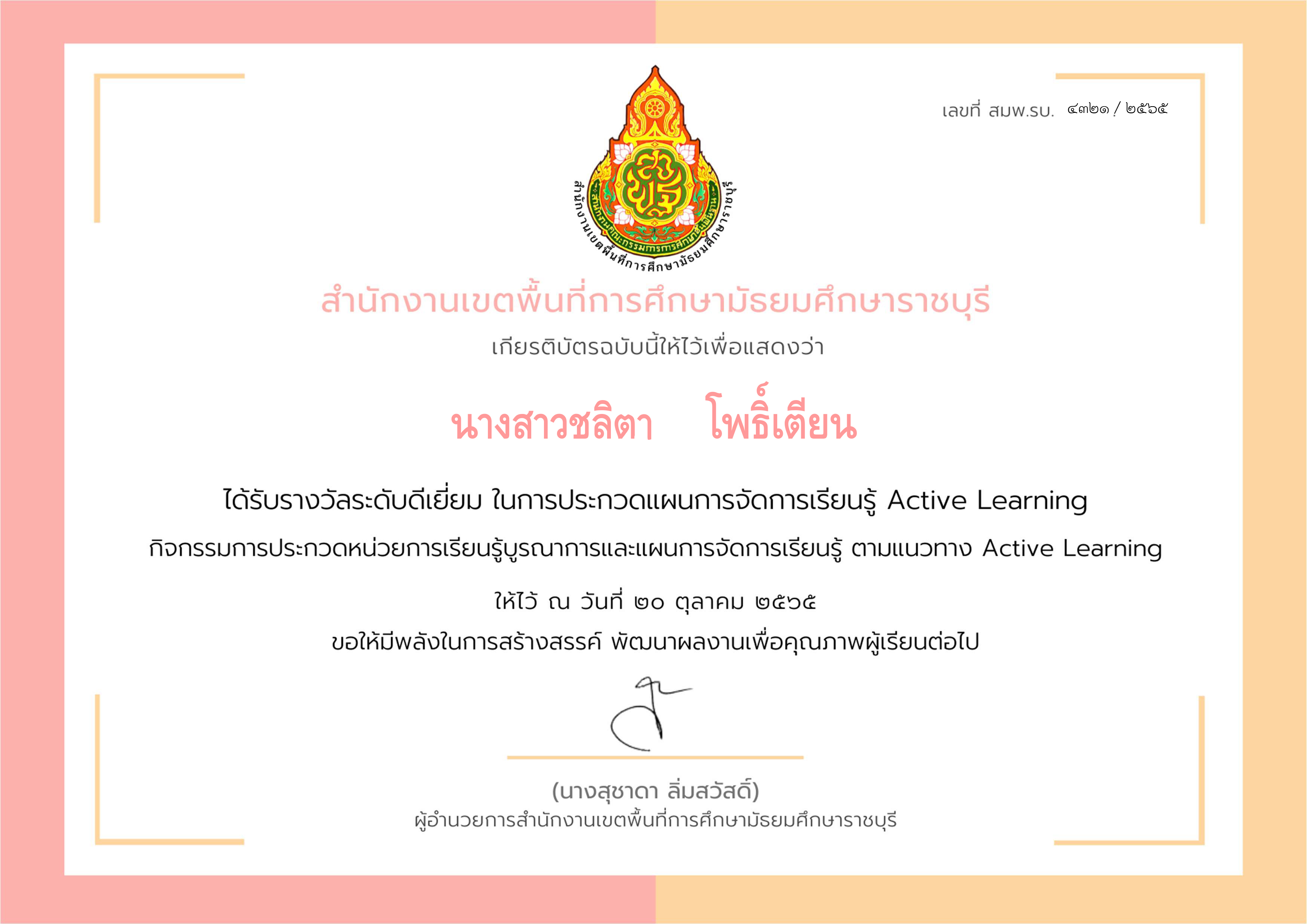นางสาวชลิตา โพธิ์เตียนนางสาวชลิตา โพธิ์เตียน ได้รับรางวัลระดับดีเยี่ยม ในการประกาดแผนการจัดการเรียนรู้ Active Learning กิจกรรมการประกวดหน่วยการเรียนรู้บูรณาการและแผนการจัดการเรียนรู้ ตามแนวทาง Active Learning ให้ไว้ ณ วันที่ 20 ตุลาคม 2565