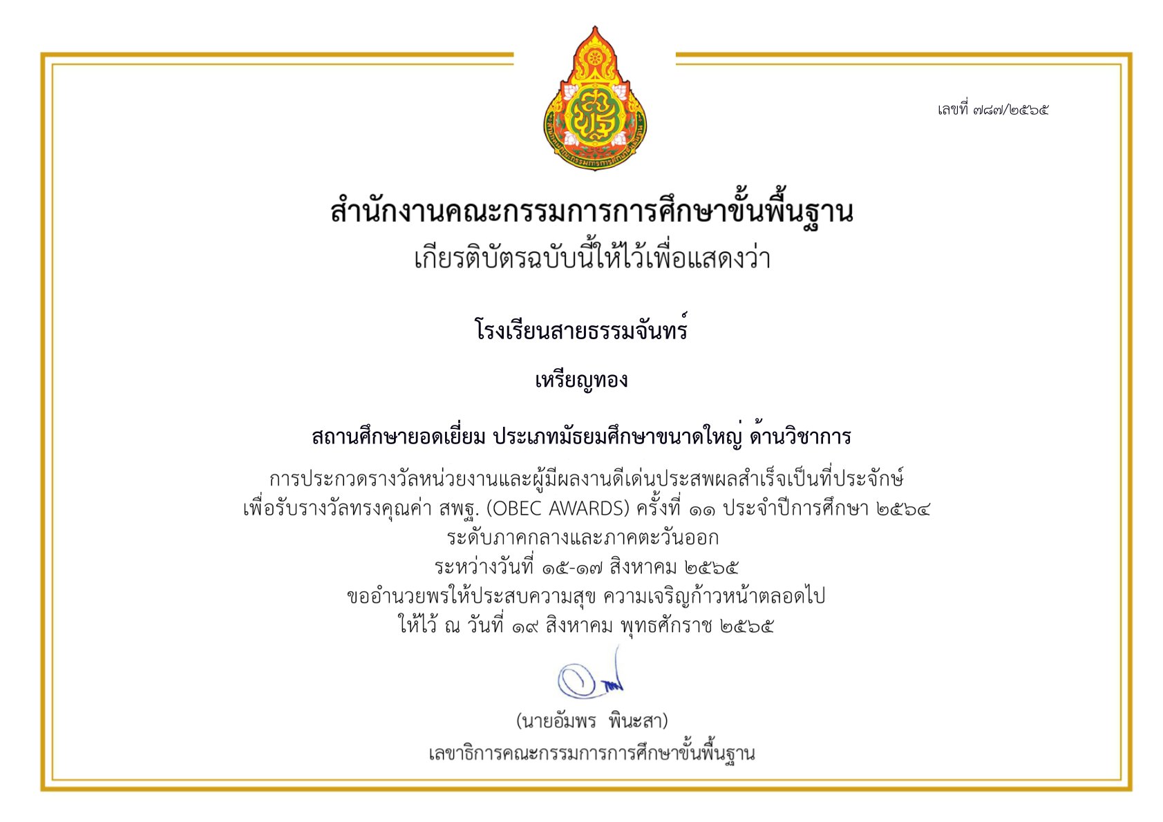 โรงเรียนสายธรรมจันทร์ระบบการดูแลช่วยเหลือนักเรียนประจำปี 2565 เกียรติบัตรยอดเยี่ยม อันดับที่ 4 ประเภทโรงเรียนมัธยมศึกษาขนาดใหญ่