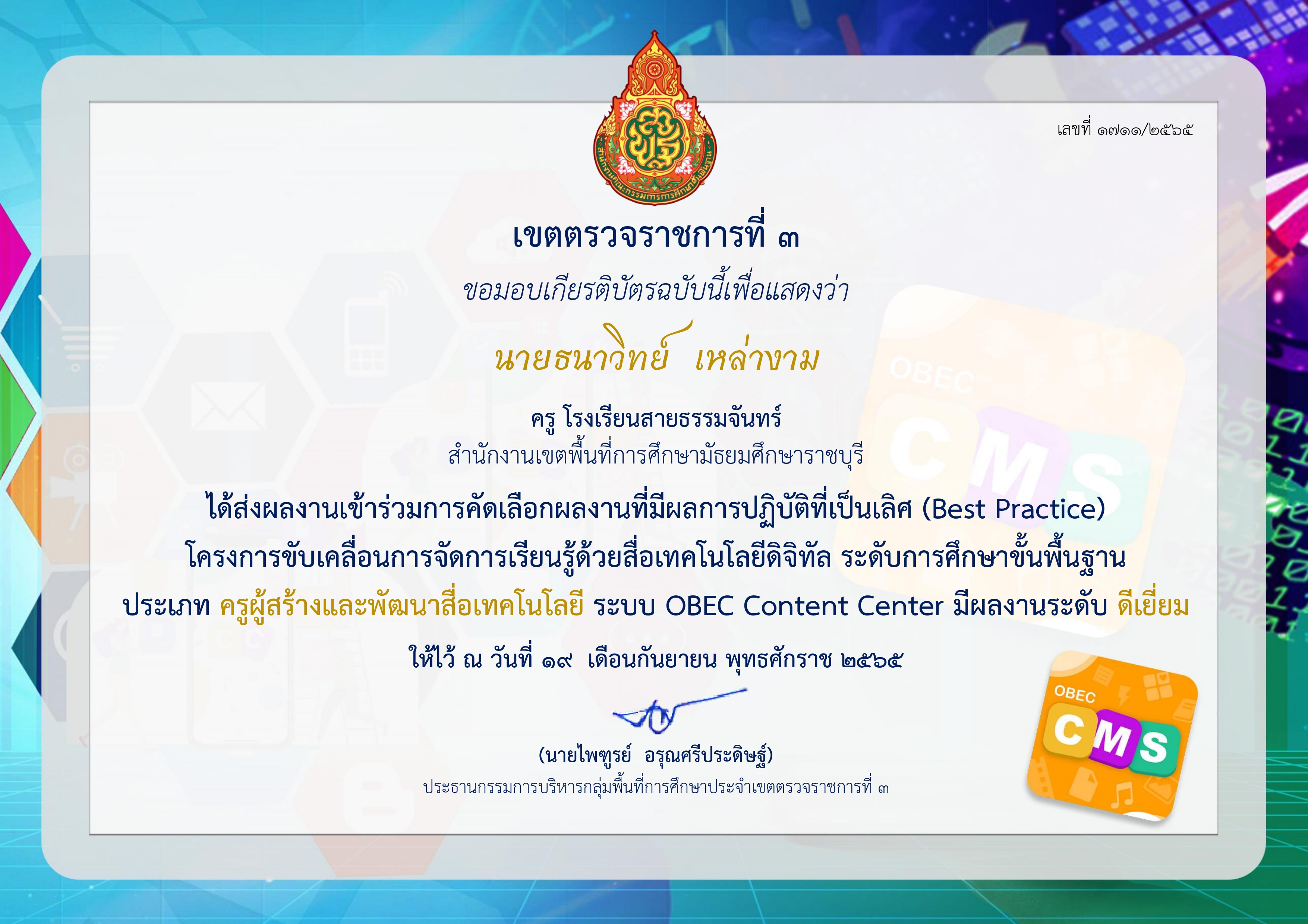 นายธนาวิทย์ เหล่างามได้ส่งผลงานเข้าร่วมการคัดเลือกผลงานที่มีผลการปฏิบัติที่เป็นเลิศ (Best Practice) โครงการขับเคลื่อนการจัดการเรียนรู้ด้วยสื่อเทคโนโลยีดิจิทัล ระดับการศึกษาขั้นพื้นฐาน ประเภท ครูผู้สร้างและพัฒนาสื่อเทคโนโลยี ระบบ OBEC Content Center มีผลงานระดับ ดีเยี่ยม
