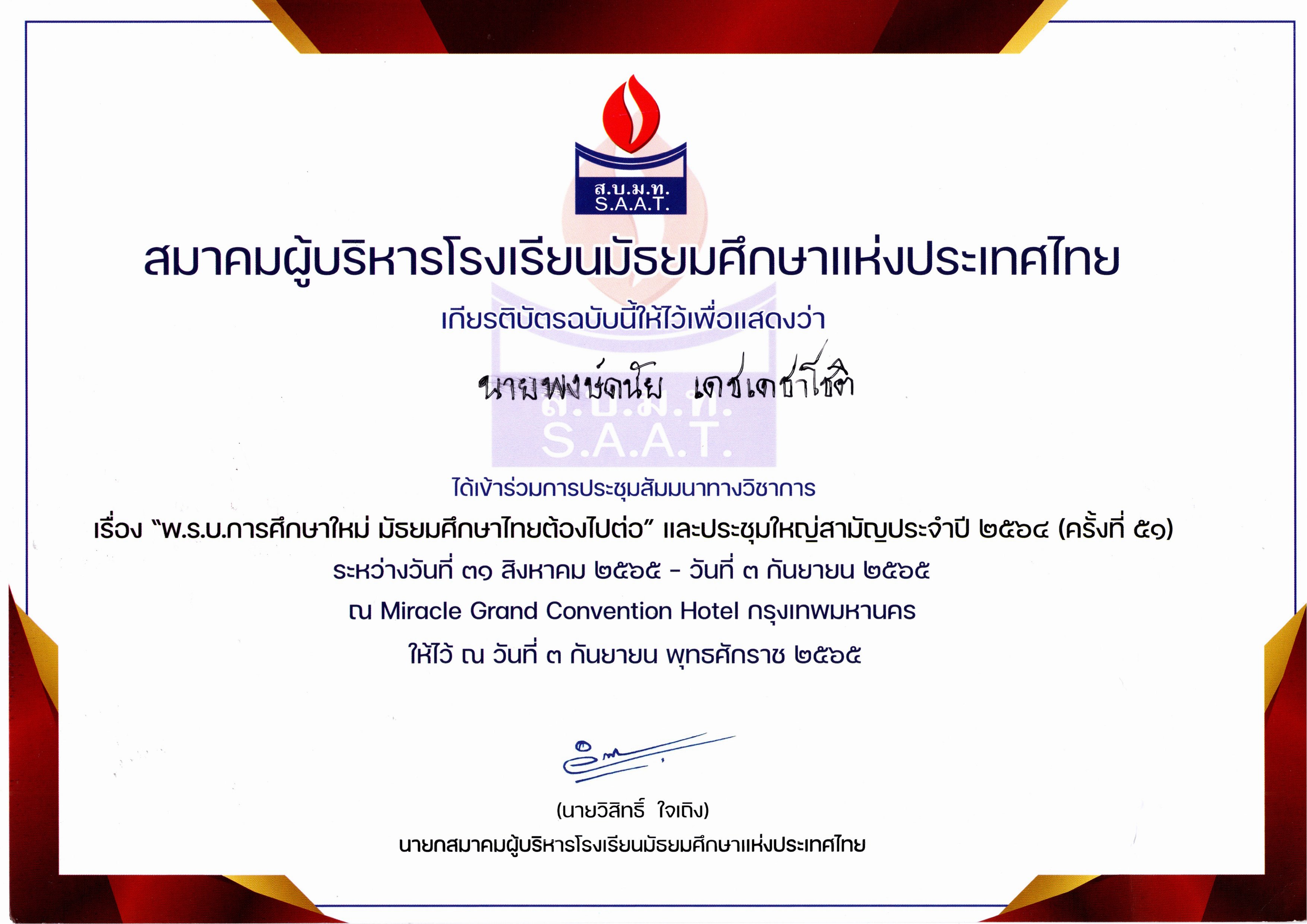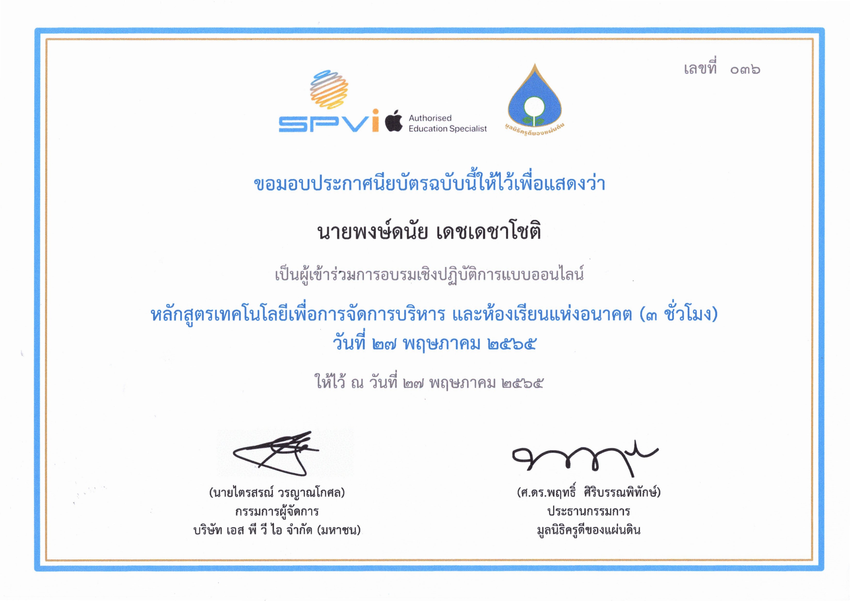 นายพงษ์ดนัย เดชเดชาโชติเป็นผู้เข้าร่วมการอบรมเชิงปฏิบัติการแบบออนไลน์ หลักสูตรเทคโนโลยีเพื่อการจัดการบริหาร และห้องเรียนแห่งอนาคต (3 ชั่วโมง)