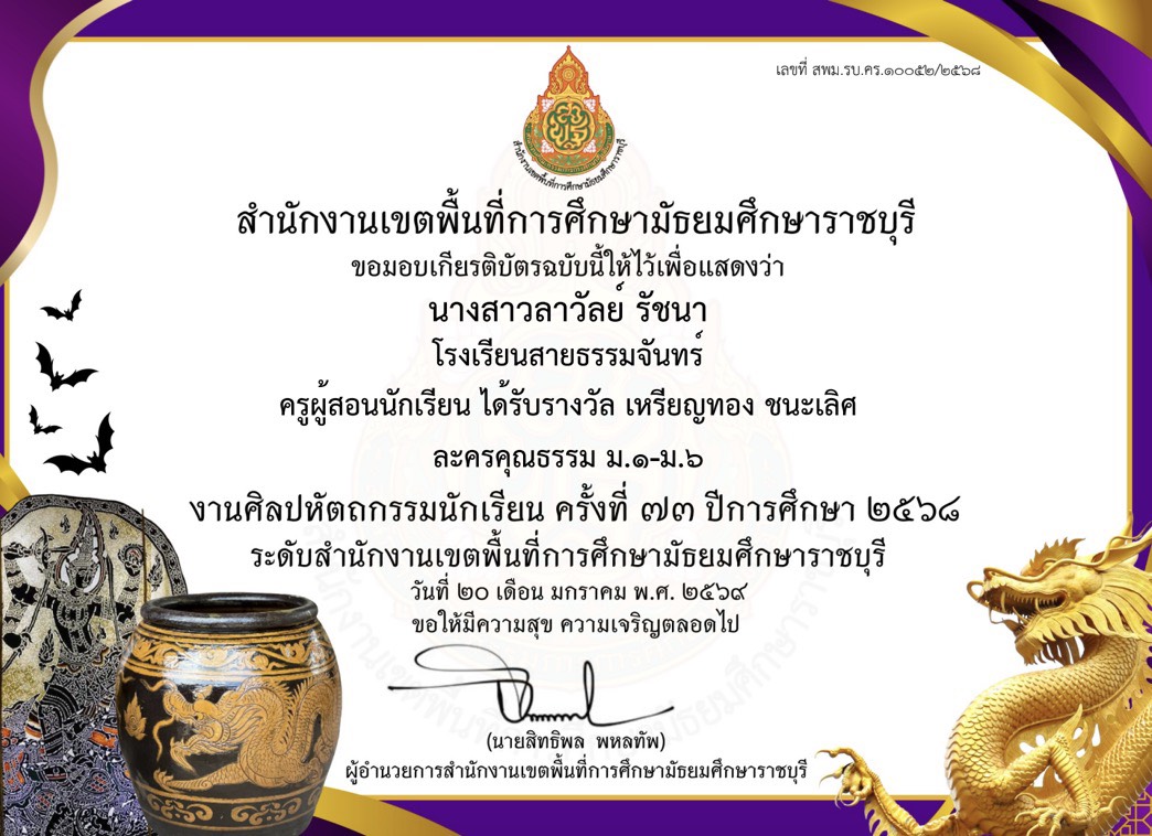 นางสาวลาวัลย์ รัชนาครูผู้สอนนักเรียน เหรียญทอง รองชนะเลิศอันดับ 1 การประกวดภาพยนตร์สั้น ม.1-3